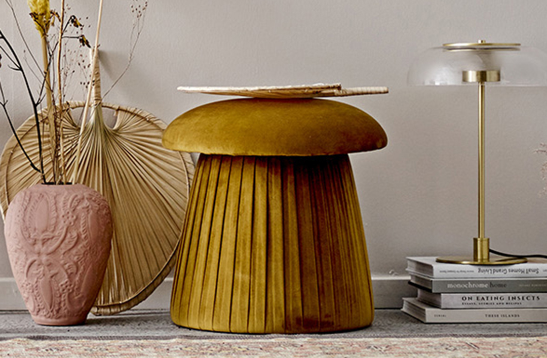 Das heißt jetzt nicht, dass du zum beigefarbenen Sofa unbedingt Knallrot kombinieren musst! Taste dich auch gerne an weitere Erdfarben, wie beim Sitzpouf von Bloomingville heran. Der bräunliche Ockerton sieht sehr elegant aus und auch das Pilz-Design verleiht dem Modell das ganz gewisse Etwas.