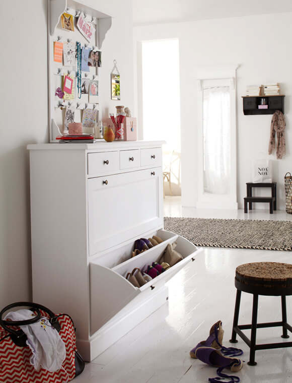 Ideal zum Schuhe an- und ausziehen und dabei auch noch super dekorativ sind Bänke. In kompakter oder langer Form erhältlich, können sie fast in jeder Diele ein Plätzchen finden und den Empfangsbereich wohnlich abrunden. Der Clou dabei: Viele der Modelle liefern mit einer klappbaren Sitzfläche weiteren Stauraum, der für Sitzkissen, Modeaccessoires oder Kinderspielzeug befüllt werden kann. Meine Empfehlung: Die (Aufbewahrungs-) Bänke auch für andere Räume nutzen. Wer mit Renovieren von neuen Küchen oder Kinderzimmern fertig ist, kann die Möbelstücke als gemütliche Alternative zu Kindersesseln oder Essstühlen verwenden.