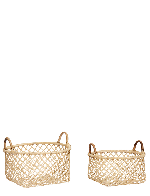 Luftiges Design. Das 2er Set Körbe aus Rattan von HÜBSCH Interior findet in jedem Zuhause schnell Verwendung. Das praktische Duo in den zwei Größen 29xØ41 cm und 35xØ49 cm kann idealerweise zu den unterschiedlichsten Wohnstilen kombiniert werden und dort für Ordnung sorgen. Dabei haben es vor allem helle Einrichtungen, die auf weißes Interieur oder Holzmöbel setzen, besonders leicht. Du kannst zwischen einem Set in natur und in schwarz wählen. Die Korbgeflechte mit den praktischen Griffen kommen hierbei bestens zur Geltung und lassen sich wunderbar dekorativ zu den Einrichtungsgegenständen kombinieren. Das 2er Set Körbe aus Rattan von HÜBSCH Interior versprüht mit seinem luftigen und offenen Design einen modernen Charme und ist ein hübscher Aufbewahrungsort für alles, was du geordnet und flexibel verstauen möchtest. Viel Freude mit den Körben.Details: