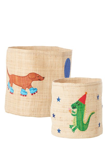 Party Animals! Das süße 2er Set Körbe mit einem Dino und einem Dackel Motiv von rice bereitet Freude. Denn die süßen Designs mit einem Rollschuh fahrenden Hund und einem Drachen mit Partyhut auf sind wirklich detailverliebt. Die bezaubernden Naturkörbe aus natürlichem und nachhaltigem Raffia Bast sind von Hand gefertigt und haben einen hellen Naturton. Da kommen die farbenfrohen Motive prima zur Geltung. Die zwei Körbe in zwei verschiedenen Größen (25xØ25 cm und 20xØ20 cm) sind eine schöne Dekoration in jedem Kinderzimmerregal oder in der Garderobenbank. Verstaue in den Aufbewahrungskörben Spielzeug, Mützen und Handschuhe sowie viele andere kleine Dinge. Die runden Bastkörbe sind doppelwandig geflochten und haben daher einen stabilen Stand. Da Bast ein natürliches Material ist und die Produkte handgefertigt sind, kann jedes Produkt in der Größe variieren und diese Variation spiegelt sich auch in der Farbgebung wider. Das bedeutet, dass zwei Produkte nie ganz gleich sind, was den unvergleichlichen Charmes des Labels rice ausmacht. Wir wünschen viel Freude mit dem wunderschönen 2er Set Körbe mit Dino und Dackel Design von rice. Psst... immer auch eine perfekte Geschenkidee zum Kindergeburtstag. Details: