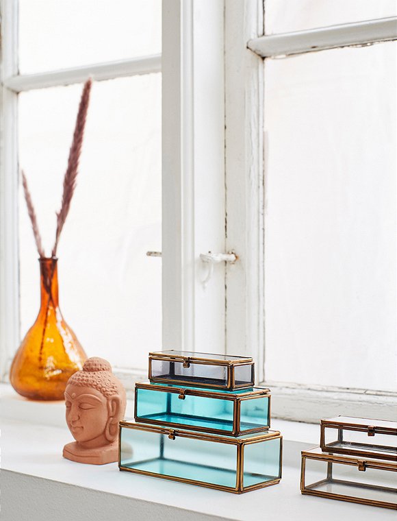 Mit dem wunderschönen 3er Set farbige Glasboxen von Madam Stoltz bringst du frische Farben und stilvolles Design in dein Zuhause. Das Set beinhaltet Glaskästen in drei verschiedenen Größen und transparenten Farben: die kleine Box in einem eleganten Grauton misst 3x4x10 cm. Perfekt, um darin Schmuckstücke oder besondere Sammlerstücke aufzubewahren. Die mittlere Glasbox in einem erfrischenden Türkiston hat die Maße 5x5,5x13 cm. Sie bietet ausreichend Platz für verschiedenste Gegenstände und verleiht jedem Raum einen Hauch von Lebendigkeit. Die große Box in einem zarten Seegrünton ist mit ihren Abmessungen von 5,5x7x15 cm ein echter Blickfang. Ihre vielseitige Verwendungsmöglichkeit macht sie zu einem unverzichtbaren Accessoire in deinem Zuhause. Ob gestapelt auf der Fensterbank, im Regal oder im Badezimmer, die Glasboxen setzen überall stilvolle Akzente. Die transparente Gestaltung der Boxen ermöglicht einen klaren Blick auf den Inhalt, während die charmanten Kanten mit einer messingfarbenen Einfassung das Design abrunden. Das Set ist auch eine großartige Geschenkidee für Freunde und Familie. Das 3er Set farbige Glasboxen von Madam Stoltz ist eine wunderbare Ergänzung zu deiner Einrichtung und verleiht jedem Raum eine besondere Note.