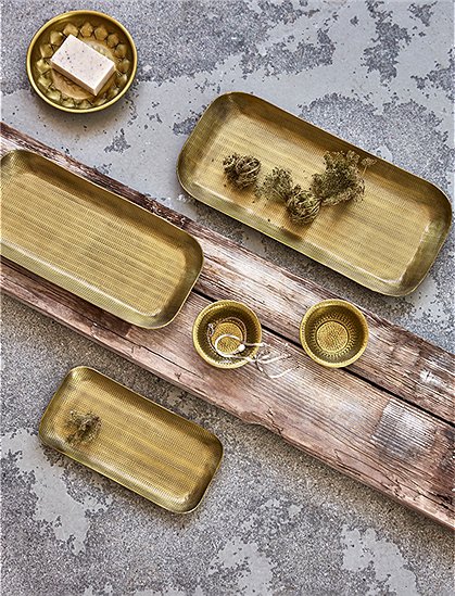 Das 3er Set Trays Plato aus Metall von house doctor bringt Eleganz in dein Zuhause. Die drei handgefertigten Tabletts mit einer goldenen Oberfläche und einem geprägten Muster sind perfekt für Dekorationen oder als gemütliche Serviertabletts geeignet. Verwende sie, um Kerzen, kleine Skulpturen oder Snacks stilvoll zu präsentieren. Du erhältst ein Set bestehend aus drei verschiedenen Größen: 2x12x23,5 cm / 2,5x15x31 cm und 2,5x17x31,5 cm stehen zur Auswahl. Setze elegante Akzente auf dem gedeckten Tisch im Esszimmer oder der Kommode im Wohnraum. Mit ihrem goldenen Finish sind die handgefertigten Metalltabletts eine einzigartige Dekoration mit Stil auf jedem Tisch. Wir wünschen viel Freude mit dem 3er Set Trays Plato aus Metall von house doctor.