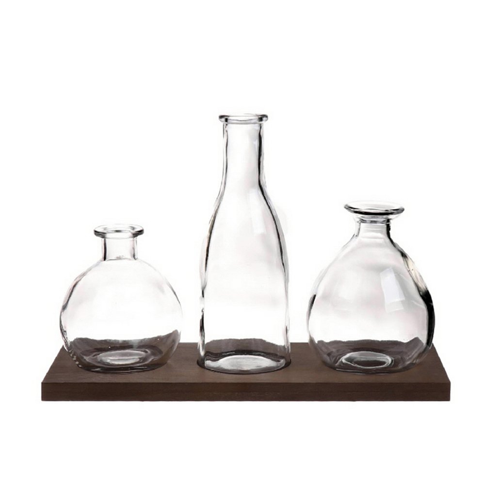 Tolle kleine Deko! 3er Set Vasen von Naturalys - für jede Menge schöne Arrangements. Und das Tollste, dass kleine Tablett wird gleich mitgeliefert. Du kannst die schöne Dekoration auf den Tisch, die Kommode oder auf das Sims im Badezimmer stellen - mit ein paar einzelnen Blümchen holst du dir damit ruckzuck den Sommer nach Hause. Die Vasen sind insgesamt 20 x 10,5 x 28 cm groß und lassen sich mit dem Tablett schnell von einem Ort zum Anderen tragen... Die süßen unterschiedlichen Vasen sind aus Klarglas gearbeitet - das schlichte Tablett ist aus Holz hergestellt. Hab viel Vergnügen mit dem 3er Set Vasen von Naturalys - so wandelbar, dass man sie auf keinen Fall mehr missen möchte.Details: