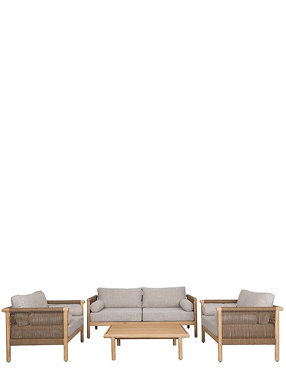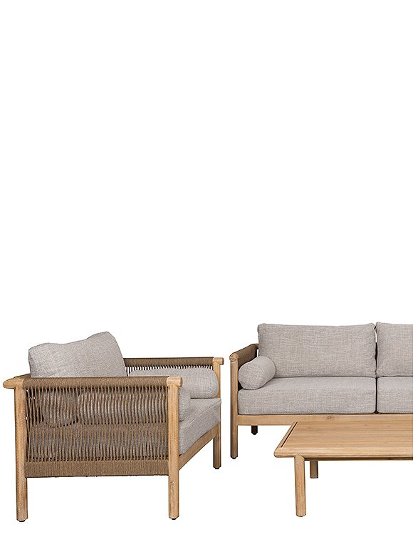 Mit dem 4-teiligen Lounge-Set Oasis von Dutchbone verwandelst du deinen Außenbereich in eine stilvolle Wohlfühloase. Auch wenn es noch nicht so heiß ist, schafft die Oasis-Möbelserie eine behagliche Atmosphäre, in der du entspannen und abschalten kannst. Das Set ist als Komplettensemble erhältlich und besteht aus einem Zweisitzer-Sofa, zwei Sesseln sowie einem passenden Tisch. So hast du alles, was du für entspannte Stunden auf der Terrasse, dem Balkon oder im Garten brauchst – stilvoll, komfortabel und harmonisch aufeinander abgestimmt. Großzügige Sitz-, Rücken- und Armlehnenkissen ruhen auf dem stabilen Rahmen aus Akazienholz und bieten dir höchsten Komfort. Der Bezug aus wasserabweisendem Olefin-Gewebe ist dabei nicht nur angenehm weich, sondern auch bestens für den Einsatz im Freien geeignet. Die Kissen harmonieren perfekt mit der eleganten grauen Lasur des Holzes, das mit einem grauen Lasuröl behandelt wurde und so seine natürliche Ausstrahlung behält. Ein besonderes Highlight dieser Serie ist das dekorative Geflecht, das sich verspielt zwischen Rückenlehne und Armlehnen spannt. Dieses Detail verleiht dem Set eine leichte, moderne Optik mit charakterstarkem Designanspruch. Mit dem 4-teiligen Lounge Set Oasis von Dutchbone schaffst du dir deinen persönlichen Rückzugsort unter freiem Himmel – gemütlich, hochwertig und zeitlos schön.