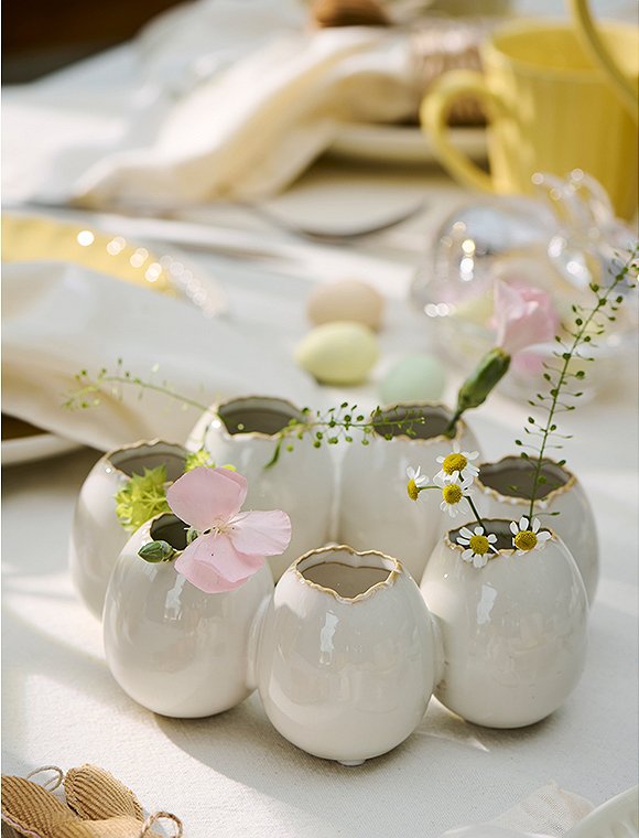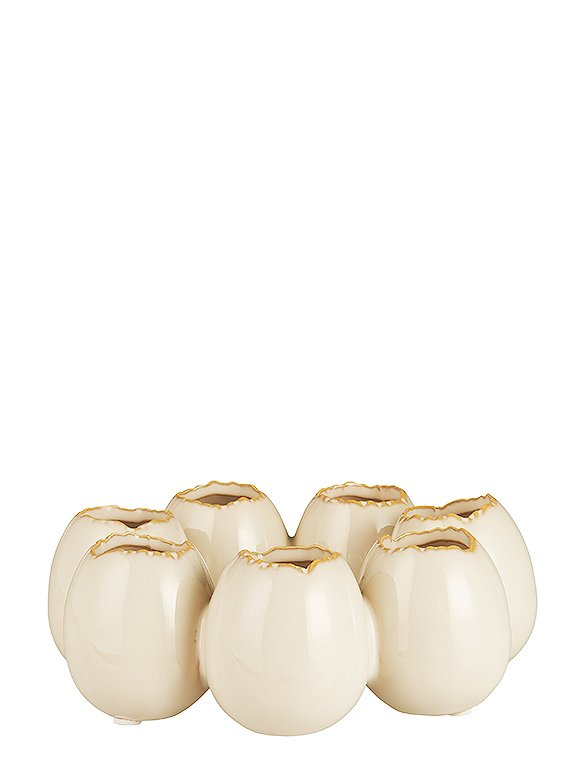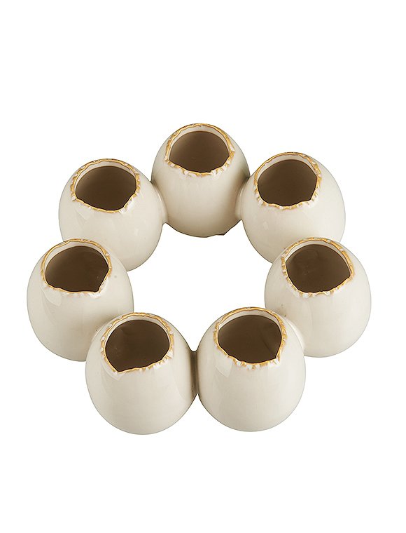 Die 7 ei-förmigen Vasen im Kreis aus Steingut von Ib Laursen bringen zarten Frühlingszauber in dein Zuhause. In einem feinen Beige bzw. sanften Creme Ton gehalten, wirkt das Modell natürlich, warm und zeitlos schön. Es besteht aus sieben kleinen, ei-förmigen Vasen, die harmonisch im Kreis angeordnet sind und zusammen einen Vasenring mit einem Durchmesser von 19,5 cm bilden. Jede einzelne Vase ist 6,5 cm hoch und bietet Platz für kleine Blumen oder zarte Zweige. Du kannst in jeder Öffnung eine einzelne Blüte platzieren und so kleine Frühlingsboten wie Schneeglöckchen, Traubenhyazinthen oder Gänseblümchen stilvoll in Szene setzen. Auch Trockenblumen, Gräser oder feine Zweige machen sich wunderbar und unterstreichen den natürlichen Charakter der Keramik. Der Vasenring eignet sich perfekt als Tischdekoration, zum Beispiel für den Ostertisch, den Kaffeetisch im Frühling oder als ruhiger Blickfang auf Sideboard, Fensterbank oder Regal. Ebenso schön wirkt er als dezente Deko im Eingangsbereich oder als liebevolles Geschenk für Blumenliebhaber. Durch seine ruhige Farbgebung lässt sich die Vase vielseitig kombinieren und passt sowohl zu skandinavischen als auch zu natürlichen Wohnstilen. Die 7 ei-förmigen Vasen im Kreis, Steingut von Ib Laursen bieten eine kreative und dekorative Art, kleine Blumenarrangements zu gestalten und deinem Zuhause eine frische, frühlingshafte Atmosphäre zu verleihen. Wir wünschen viel Freude beim Dekorieren.