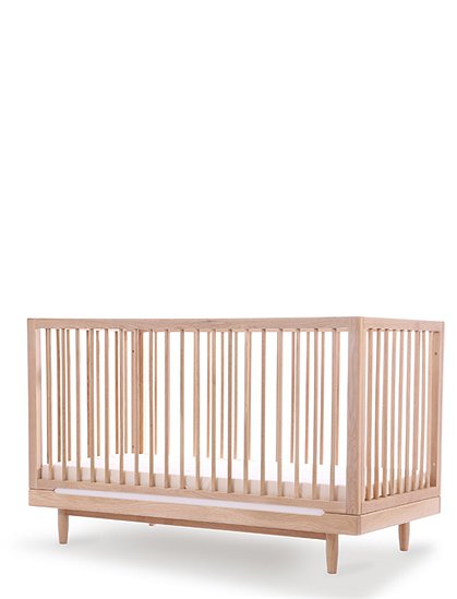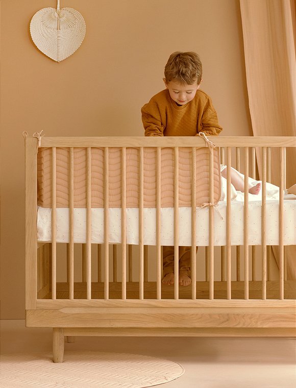 Toll für die ersten Jahre... das Babybett PURE aus Eichenholz von Nobodinoz ist ein wunderschönes, natürliches, kleines Bettchen - für die Matratzengröße 70 x 140 cm. Und langlebiger als eine kleine Krippe, wächst das süße Holzbett ganz einfach mit. Zunächst einmal schlummern die Kleinen sicher und bequem in dem wunderschönen Gitterbettchen. Dieses ist aus massivem, zertifiziertem Eichenholz gefertigt und von der eleganten matten Oberfläche bis hin zu den abgerundeten Beinen geradlinig und zeitlos gehalten. Wie immer setzt das spanische Label auch bei diesem Kinderbett auf Qualität, Nachhaltigkeit und höchste Ansprüche an Komfort und Design. Je nach Alter des Babys kann die Höhe der Matratze in zwei verschiedenen Höhen fixiert werden. Das Modell entspricht den europäischen Normen EN 71/3 und EN 716 und ist ausschließlich mit ungiftigen Lacken und Farben behandelt. Später, kann das süße Eichenbett mit den Erweiterungs-Sets umgebaut werden - die hohen Gitterstäbe werden durch ein niedrigeres Kopf-, Fuß- und Rückenteil ausgetauscht und können zusätzlich an der Einstiegskante mit einem Rausfallschutz gesichert werden. Besondere Ausstattung: Im Lieferumfang enthalten ist ein Leistenzubehör, in Natur, grün, rosa und weiß, welches Sie passend zu Ihrer Einrichtung auswählen können und in die Vertiefungen an den Längsseiten im Bettrahmen einsetzen. Eine Matratze mit einer Höhe von max. 15 cm muss separat erworben werden. Das Holzbett wird zerlegt geliefert und ist dank der beiliegenden Montageanleitung schnell aufgebaut. Wir wünschen dir viel Freude mit dem Babybett PURE aus Eichenholz von Nobodinoz mit dem ein stilvolles und langlebiges Möbelstück in dein Kinderzimmer einzieht.Details: