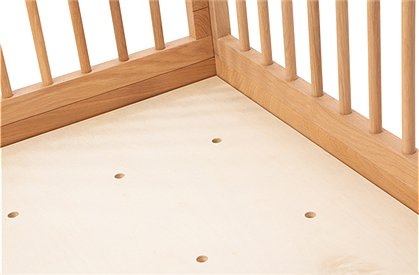 Maße (HxBxL):Gitterbett: 90 x 75 x 145 cmLiegefläche 70 x 140 cmBett umgebaut:50 x 75 x 145 cmflaches Gitter 3 Seiten:28 x 75 x 145 cmRausfallschutz: 28 x 145 cm BarriereMaterial: Massivholz Eiche, FSC-zertifiziert