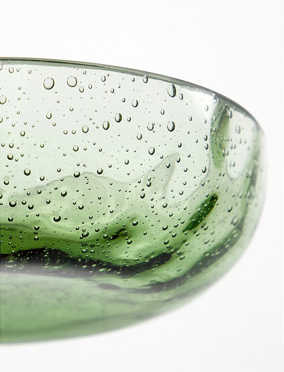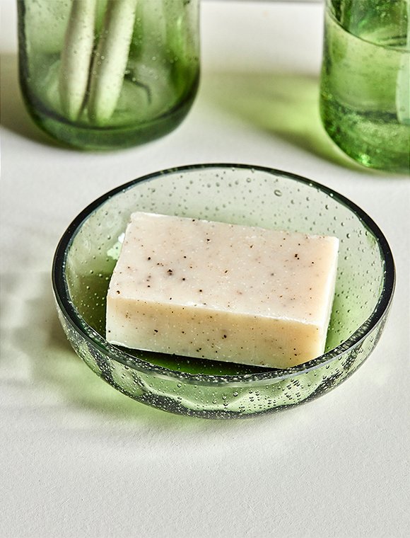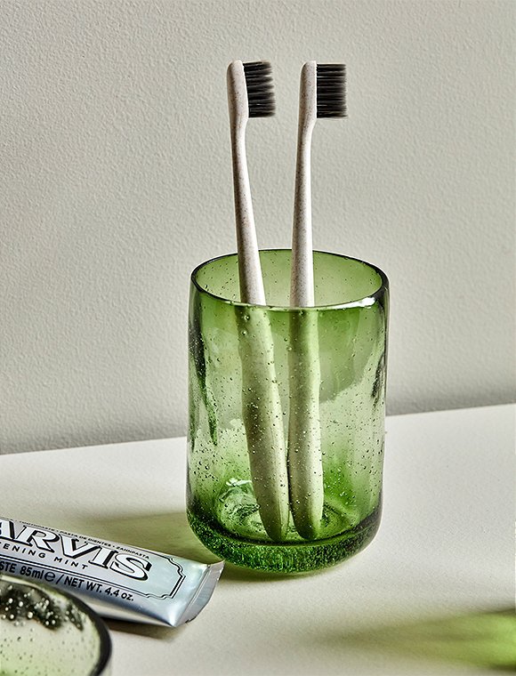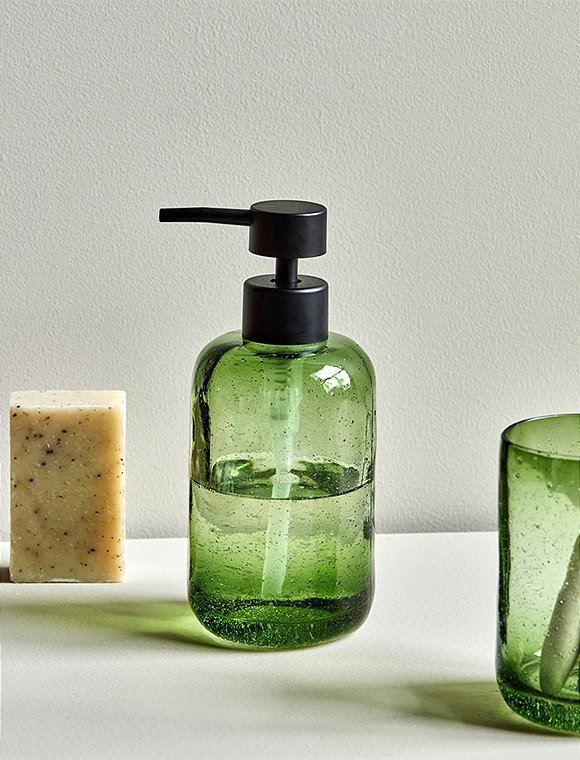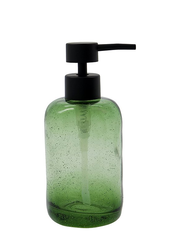 Maße (HxØ): Zahnputzbecher: 10,5 x 7,2 cmSeifenschale: 3,5 x 12 cmSeifenspender: 17 x 7,4 cm Material: Handgemachtes GlasReinigung:von Hand waschen