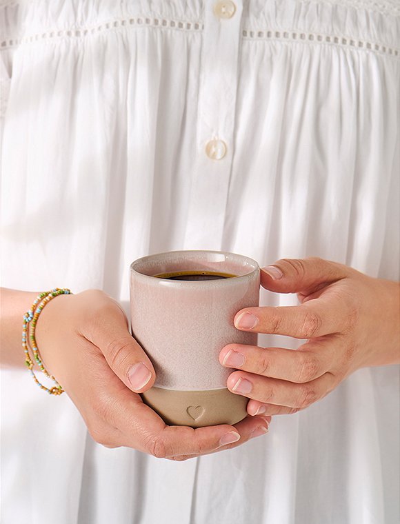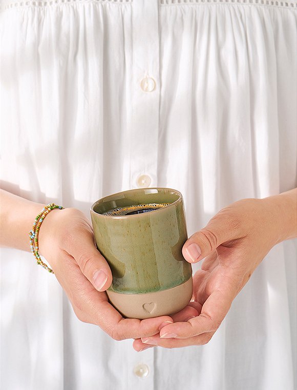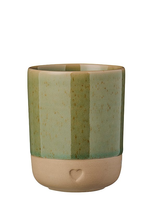 Dein neuer Lieblingsbecher! Der formschöne Becher Heart aus Ton, 190 ml von Ib Laursen bringt dir ein Stück skandinavische Gemütlichkeit direkt nach Hause! Mit seinem kleinen, eingeprägten Herz ist er nicht nur super süß, sondern auch ein echter Hingucker. Ob für deinen Morgenkaffee, Tee oder Cappuccino – das Modell liegt einfach perfekt in der Hand und macht jede Auszeit noch ein bisschen schöner. Die Basis des Bechers besteht aus einer schmalen, mattbraunen Textur aus Ton. Der obere Bereich (ca. 2/3) ist mit einer glasierten Kante aus Steingut veredelt, die in fünf harmonischen Farben erhältlich ist: hellblau, hellgrün, olivgrün, rosa oder weiß. Ob als Geschenkidee zum Valentinstag, Mutter- oder Vatertag oder einfach nur, um dir selbst eine Freude zu machen – dieser Becher passt immer. Hol' dir mit dem Becher Heart aus Ton, 190 ml von Ib Laursen ein Stück skandinavische Wohlfühlatmosphäre mit Herz nach Hause! Entdecke auch die passenden Kaffeetassen Heart in unserem Sortiment. Details: