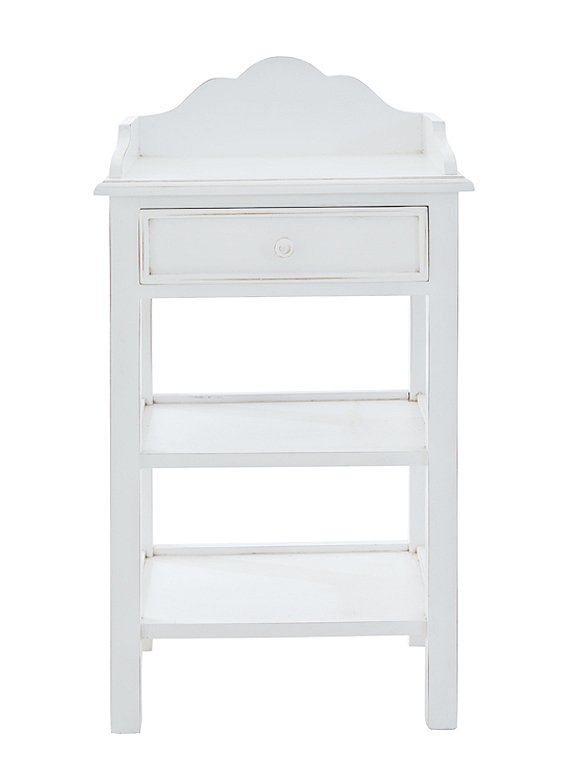 Klein und fein - toller Beistelltisch im Landhausstil. Das süße Tischchen passt prima neben das Bett oder dient als Ablage im Flur. Er hat zwei Ablagefächer und eine praktische Schublade für jede Menge Kleinigkeiten, so ist schnell alles verstaut und die Ordnung wirder hergestellt. Der weiß gestrichene Tisch ist sensibel aus Mahagoniholz gearbeitet und hat an der Rückseite einen schönen, dekorativen Schwung. Im Antiklook (geschliffene Kanten) gefertigt, wird er fertig montiert geliefert.
