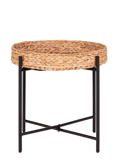 Gelungene Kombination. Der schöne Beistelltisch Naro von House Nordic bringt mit seinem schlichten Design und der Tischplatte aus dem Naturmaterial Wasserhyazinthe einen gemütlichen und natürlichen Charme in dein Zuhause. Das Gestell aus schwarz pulverbeschichtetem Metall wird platzsparend geliefert und lässt sich nach dem Auspacken ganz schnell und einfach aufklappen. In die oben überstehenden schwarzen Metallenden wird das runde Tablett aus wunderschön geflochtener Wasserhyazinthe ganz einfach eingesetzt und schon ist der kleine hübsche Begleiter fertig. Prima neben dem Sofa oder Sessel zum Abstellen von Getränken und Snacks, in Szene gesetzt mit einer dekorativen Vase oder auch als natürlicher Nachttisch. Dank seines erhöhten Randes kann das Modell Naro jederzeit problemlos verschoben werden, ohne das etwas herunterfällt. Hole dir mit dem Beistelltisch Naro von House Nordic Gemütlichkeit und Stil in deine Einrichtung. Wir wünschen viel Freude mit dem Tisch im Format 48,5xØ50 cm. Details: