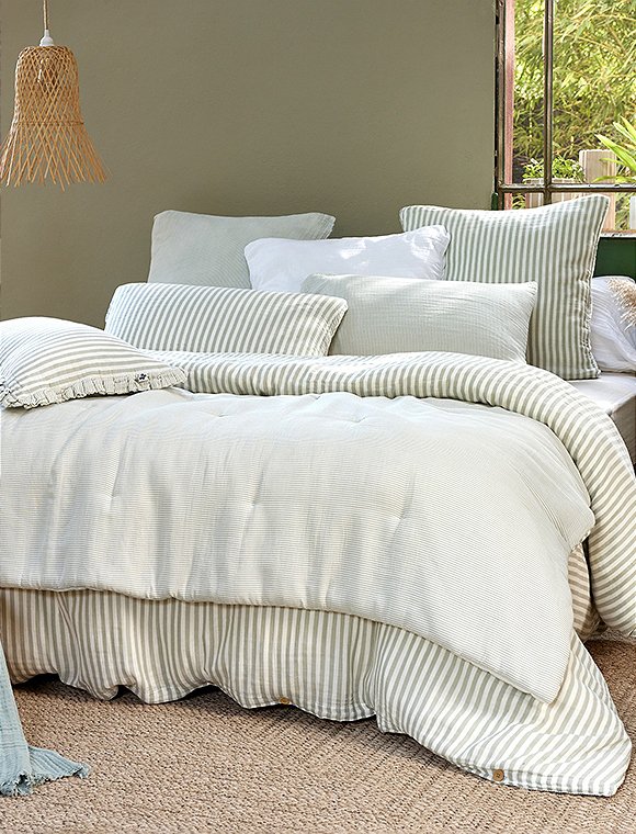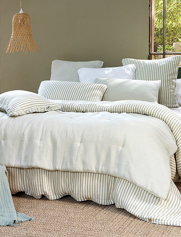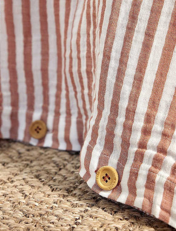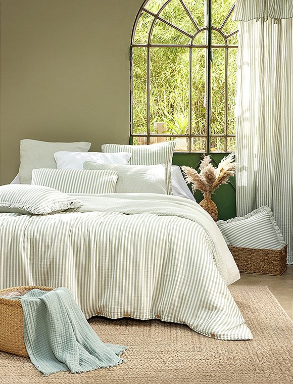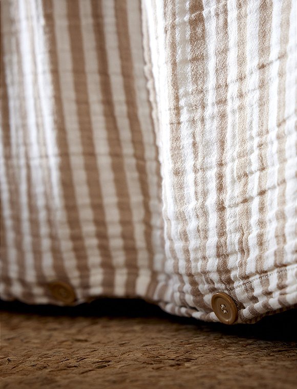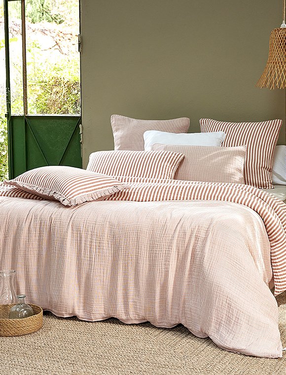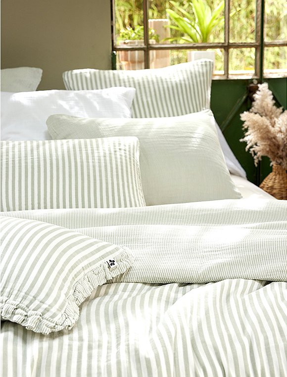 Die Bettwäsche Romie von L'effet Papillon ist zum Wenden und hat einen feinen und einen etwas breiteren Streifen. Die hübsche Wäsche aus 100% Baumwoll Gaze gibt es in drei unterschiedlichen Farben und wird einzeln bestellt. Der Bettbezug hat eine Größe von 200 x 140 cm und wird mit Knöpfen geschlossen, der Kissenbezug ist 50 x 70 cm oder 60 x 60 cm groß. Das französische Label hat es sich zur Aufgabe gemacht, qualitativ hochwertige Textilien anzubieten. So sind alle Produkte unter fairen Bedingungen entstanden und die Stoffe sind selbstverständlich Öko-Tex zertifiziert. Das Unternehmen versucht die Auswirkungen auf die Umwelt zu minimieren. Schlaf schön in der Bettwäsche Romie von L'effet Papillon und bitte achte darauf, dass du die Wahl zwischen zwei Kissengrößen hast und du daher Bett- und Kissenbezug einzeln bestellen musst.