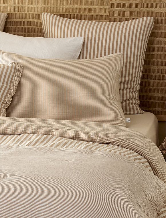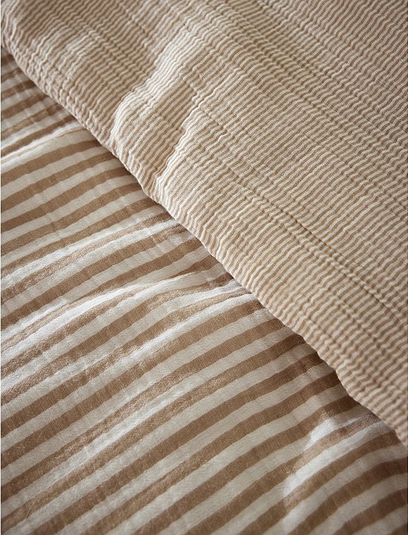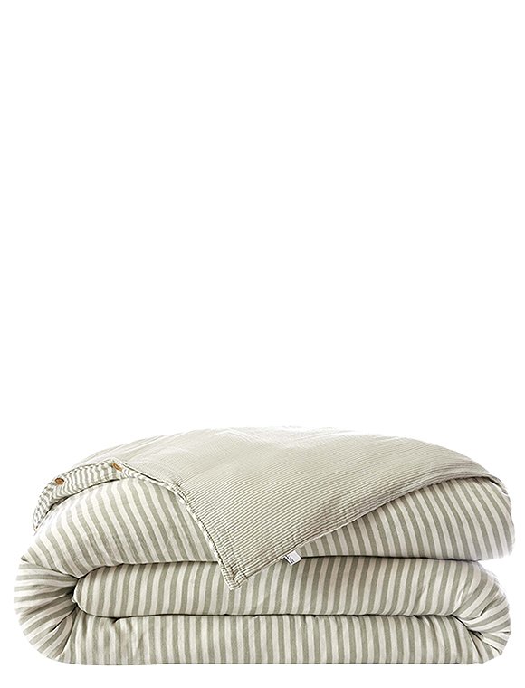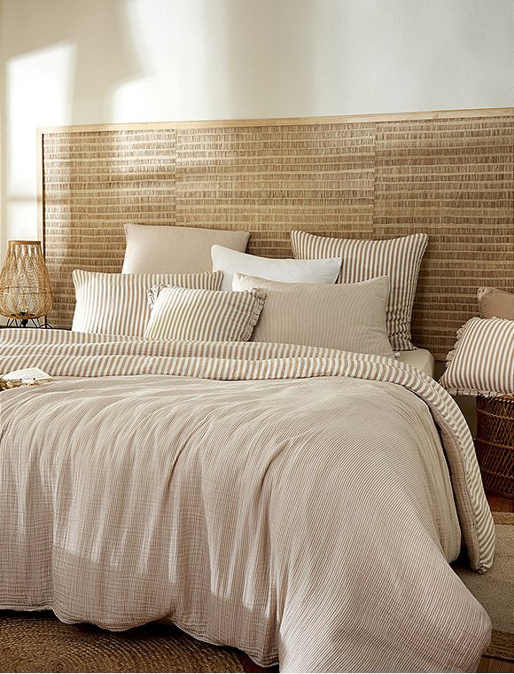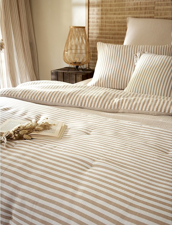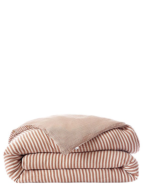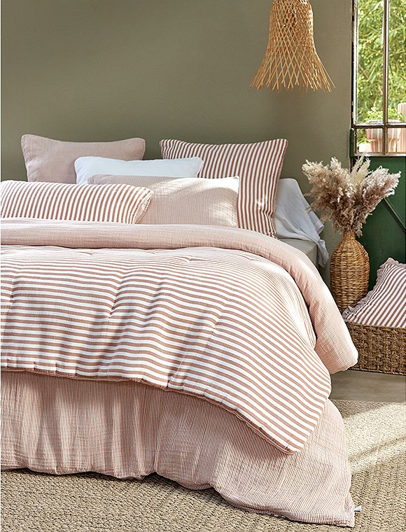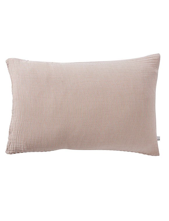 Die Bettwäsche Romie von L'effet Papillon ist zum Wenden und hat einen feinen und einen etwas breiteren Streifen. Die hübsche Wäsche aus 100% Baumwoll Gaze gibt es in drei unterschiedlichen Farben und wird einzeln bestellt. Der Bettbezug hat eine Größe von 200 x 140 cm und wird mit Knöpfen geschlossen, der Kissenbezug ist 50 x 70 cm oder 60 x 60 cm groß. Das französische Label hat es sich zur Aufgabe gemacht, qualitativ hochwertige Textilien anzubieten. So sind alle Produkte unter fairen Bedingungen entstanden und die Stoffe sind selbstverständlich Öko-Tex zertifiziert. Das Unternehmen versucht die Auswirkungen auf die Umwelt zu minimieren. Schlaf schön in der Bettwäsche Romie von L'effet Papillon und bitte achte darauf, dass du die Wahl zwischen zwei Kissengrößen hast und du daher Bett- und Kissenbezug einzeln bestellen musst.