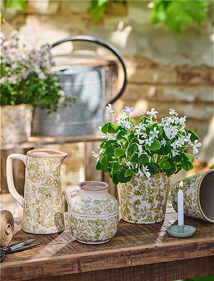 Bringe einen Hauch von Vintage in dein Zuhause – mit dem Blumentopf Blossom von Ib Laursen! Du suchst nach einem dekorativen Highlight für dein Zuhause? Der Topf Blossom aus hochwertiger Keramik vereint verspieltes Design und natürlichen Charme – perfekt, um deinem Zuhause einen besonderen Akzent zu verleihen. Ob für deine Lieblings-Zimmerpflanzen, frische Kräuter in der Küche oder einen zarten Blumenstrauß, dieser Topf ist ein echter Hingucker. Wähle zwischen zwei traumhaften Designs:  Green Blossom - mit seinem stilvollen grünen Muster, das von der Natur inspiriert ist, holst du dir den Zauber der Pflanzenwelt direkt ins Haus. Meadow Blossom - in sanftem Creme gehalten und mit einem romantischen Blumenmuster verziert, bringt dieser Topf einen Hauch von Vintage-Romantik in dein Zuhause. Beide Designs sind jeweils erhältlich in zwei Größen: 10,7xØ13,1 cm – perfekt für kleine Pflanzen oder zarte Bouquets. Oder etwas größer, 13xØ 14 cm – ideal für üppigere Arrangements oder größere Pflanzen. Entdecke das Design Meadow Blossom bei uns im Sortiment auch als passende Vase – wunderbar für selbst gepflückte Blümchen und Gräser! Der Blumentopf ist nicht nur ein stilvolles Deko-Element, sondern auch eine wunderschöne Geschenkidee – ob zum Muttertag, Geburtstag oder einfach mal so, um jemandem eine Freude zu machen. Wir wünschen viel Freude mit dem Blumentopf Blossom aus Keramik von Ib Laursen.