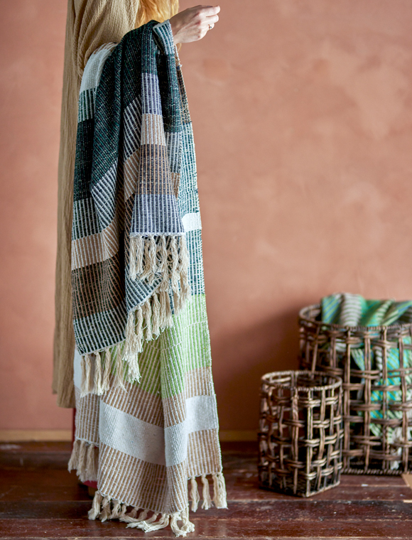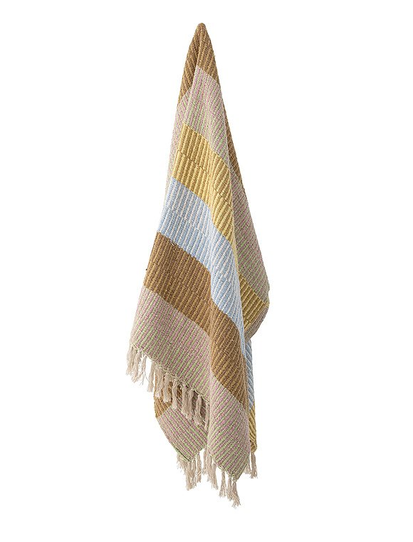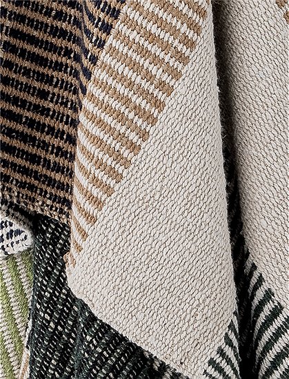 Aus recycelter Baumwolle.  Die wunderschöne Decke Isnel aus rec. Baumwolle von Bloomingville spiegelt die Philosophie des skandinavischen Labels wider. Denn anstatt die übrig gebliebenen Textilien zu entsorgen, werden die Fasern aus granulierter Baumwolle in nützliche Fasern umgewandelt und somit wiederverwendet. In diesem Fall in Form einer kuscheligen Decke, die wahlweise in einem fantastischen Farbspiel aus braunen, grünen und schwarzen Streifen gewebt ist oder entzückende Streifen in Schattierungen von Hellblau, Beige, Braun und Gelb zeigt. An den Enden hat das Plaid kleine süße Fransen. Lass' die Decke in deinem Zuhause Gemütlichkeit verbreiten oder nimm' sie an langen Sommerabenden mit nach draußen auf die Terrasse oder den Balkon. Isnel hat die Maße 160x130 cm und ist ein Teil aus der Creative Collection. Wir wünschen viele gemütliche Stunden mit der charmanten Decke Isnel aus rec. Baumwolle von Bloomingville.