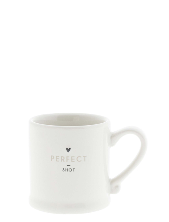 Lieblingsstück! Süßer Espressobecher mit Henkel von Bastion Collections zum schlichtweg haben wollen. Der Keramikbecher ist eine einzige Liebeserklärung an den Morgen... darum kann der Start in den Tag kaum besser gelingen. Die charmante Tasse mit einer Füllmenge von bis zu 50 ml macht sofort gute Laune, und kann mit oder ohne Untertasse benutzt werden. Der hübsche Becher lässt sich bestens kombinieren, hat einen kleinen praktischen Henkel, ist Mikrowellen und Spülmaschinen erprobt und passt perfekt zur neuen Linie des niederländischen Labels. Hier kann fröhlich mit den unterschiedlichen Mustern gespielt und gemixt werden - daher gibt es auch gleich drei Dessins - mit "take it easy", "PERFECT SHOT" und mit  "lovely espresso" kann natürlich prima nach Lust und Laune der Frühstückstisch gedeckt werden. Die Tasse ist 6 x Ø 5,5 cm groß und aus weißer, handbemalter Keramik gearbeitet. Wir wünschen dir viel Freude mit dem süßen Espressobecher mit Henkel von Bastion Collections - und mixe fleißig weiter...