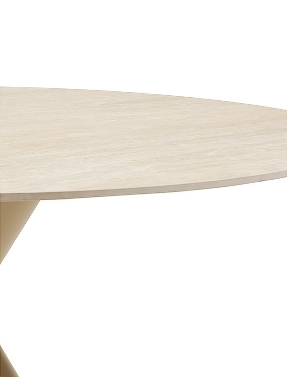Maße (HxØ): 76 x 120 cmmax. Belastung: 30 kgMaterial:Tischplatte: Keramik, Travertin-OptikTischbein: Metall (sand glänzend)