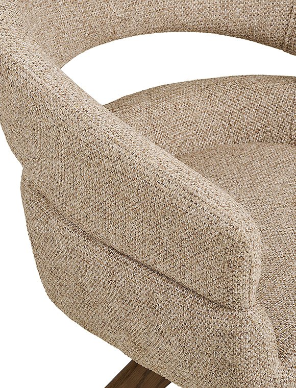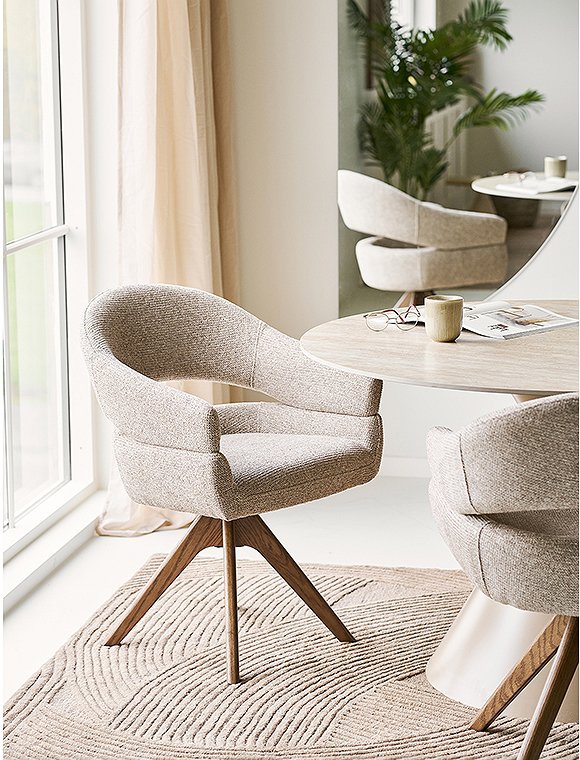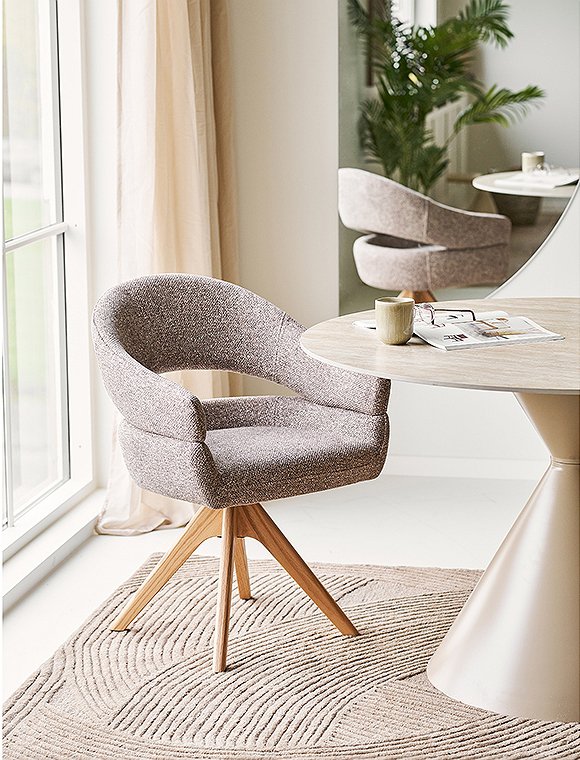 Mit dem Esszimmerstuhl Dover von House Nordic holst du dir modernes Design, hohen Sitzkomfort und durchdachte Funktionalität an deinen Esstisch. Der Stuhl überzeugt durch seine harmonische Formensprache und wirkt zugleich elegant wie einladend. Dank seiner kompakten Maße von 87x58x60 cm (mit Metallbeinen) bzw. 83x58x61 cm (mit Holzbeinen) fügt sich Dover mühelos in unterschiedliche Raumkonzepte ein, ohne dabei an Präsenz zu verlieren. Die weich gepolsterte Sitzschale aus Schaumstoff sorgt für ein angenehmes Sitzgefühl, selbst bei langen Abenden mit Familie oder Freunden. Der hochwertige Stoffbezug ist in zwei Ausführungen erhältlich: in Sandfarbe mit feiner Struktur, für einen ruhigen, klaren Look oder in warmem Braun für eine besonders gemütliche Ausstrahlung. So kannst du den Stuhl perfekt auf deinen persönlichen Einrichtungsstil abstimmen. Das Design der Sitzschale ist nicht nur optisch ein Hingucker, sondern auch ergonomisch durchdacht. Die geschwungene Rückenlehne passt sich deinem Rücken angenehm an und bietet guten Halt. Die elegante Aussparung in der Rückenlehne verleiht dem Stuhl eine leichte, moderne Note und unterstreicht seine besondere Form. Je nach Ausführung variiert auch das Gestell und setzt unterschiedliche Akzente. Die sand Variante steht wahlweise auf einem schwarz pulverbeschichteten Metallgestell mit einem zentralen Bein, das auf vier Füßen ausläuft. Oder du wählst eines der anderen beiden Modelle, die mit einem Gestell aus FSC-zertifiziertem Eichenholz ausgestattet sind - wahlweise in einem hellbraunen Naturton oder in einem dunkleren Braun, was dem Stuhl eine besonders warme und hochwertige Ausstrahlung verleiht. Ein besonderes Highlight des Esszimmerstuhls Dover ist seine 180° Drehfunktion mit Auto-Return. Nach dem Aufstehen dreht sich der Stuhl automatisch in seine ursprüngliche Position zurück, sodass er auch bei eng gestellten Esstischen stets ordentlich und ausgerichtet wirkt. Das macht Dover nicht nur komfortabel, sondern auch äußerst praktisch im Alltag. Ob als stilvoller Esszimmerstuhl, als bequeme Sitzgelegenheit im offenen Wohnbereich oder als eleganter Akzent am Arbeitsplatz – Dover lässt sich vielseitig einsetzen und begleitet Dich zuverlässig durch lange Gespräche, gemeinsame Mahlzeiten und entspannte Stunden. Der Stuhl wird zerlegt geliefert und ist mit wenigen Handgriffen schnell und unkompliziert montiert, sodass du ihn im Handumdrehen genießen kannst. Wir wünschen viel Freude mit dem komfortablen Esszimmerstuhl Dover mit Drehfunktion von House Nordic. Details: