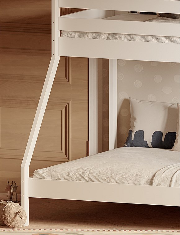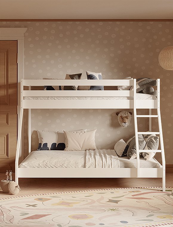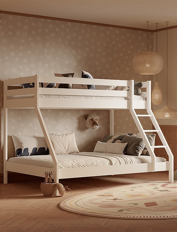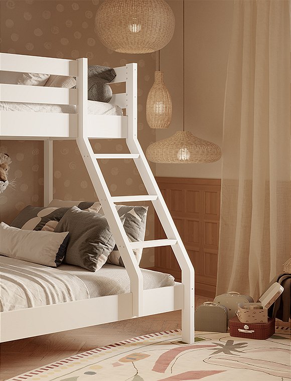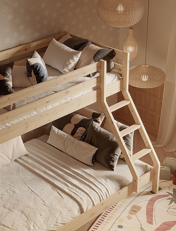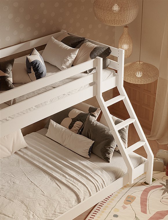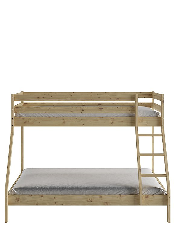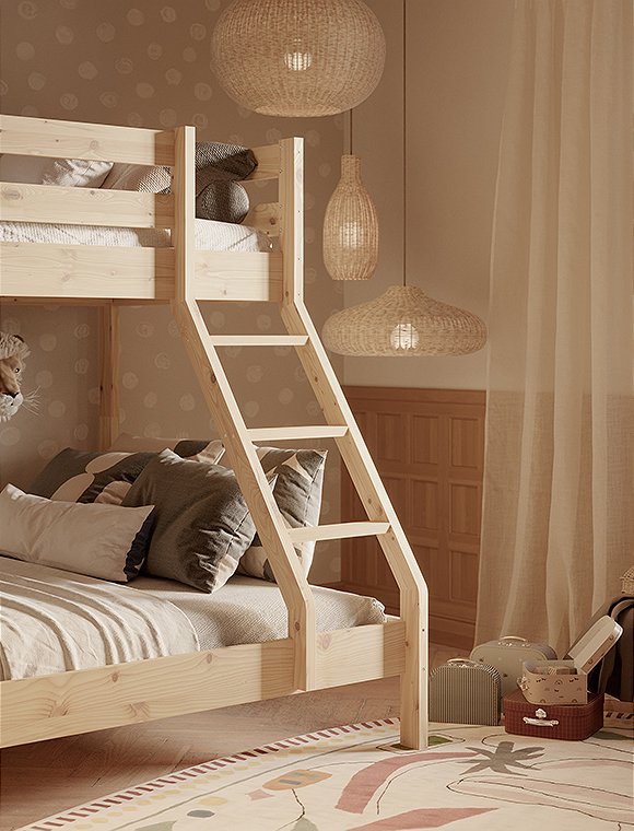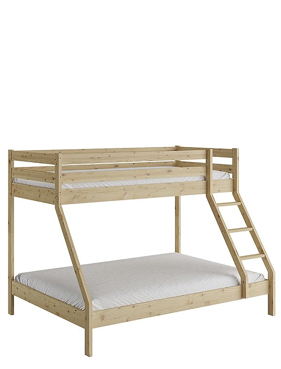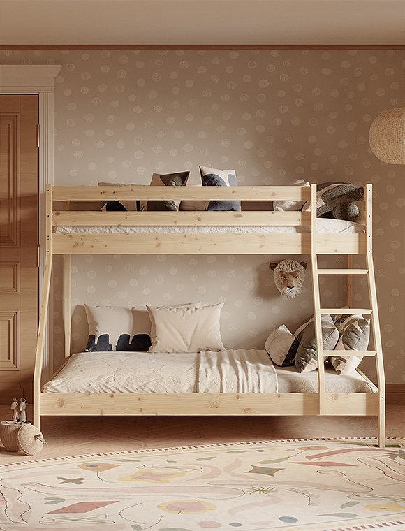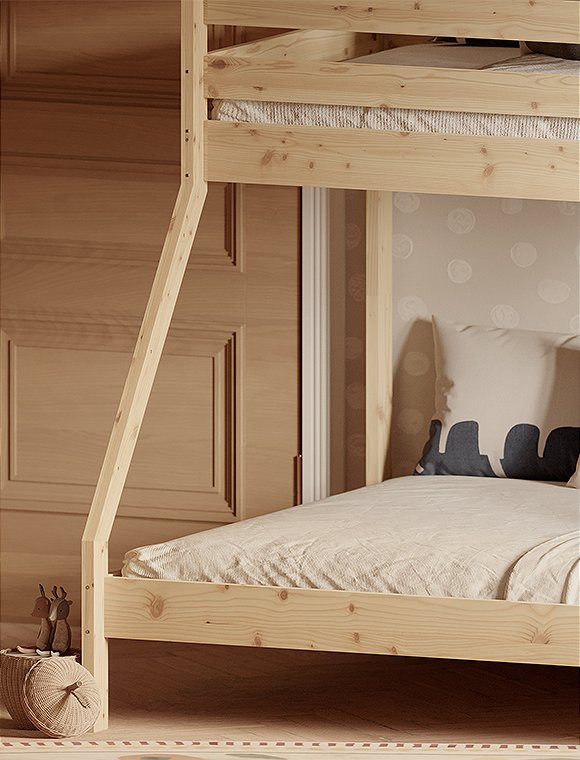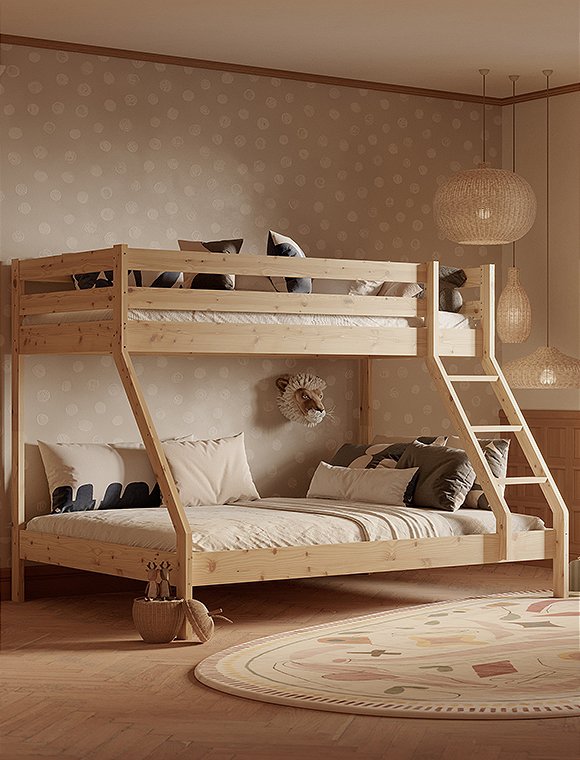 Dieses Etagenbett hat eine breite Liegefläche unten für zwei Personen und eine 90 cm Breite für oben. Es eignet sich für drei Personen, ist ideal für kleine Räume und ist perfekt wenn deine Kinder Übernachtungsbesuch lieben. Oder für dein kleines Ferienhaus, wenn du viele, viele Gäste oder deine dreiköpfige Familie unterbringen möchtest:). Das praktische wie schöne Bett aus Kiefernholz ist solide verarbeitet und gewährleistet Stabilität und Langlebigkeit. Dies ist besonders wichtig, da die Sicherheit der Benutzer auf beiden Ebenen gewährleisten sein muss. Es ist eine großartige Lösung für Geschwister - gerade wenn eins der Beiden schon etwas älter ist. Der natürliche, farblos lackierte Farbton kann in jedem Innenraum eine entspannende Atmosphäre schaffen, weiß lackiert hingegen bietet etwas mehr modernität. Das Etagenbett aus Kiefer ist in natur farblos- und in weiß lackiert erhältlich - hab viel Spaß damit.