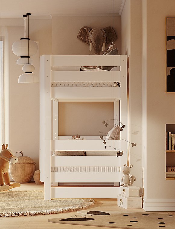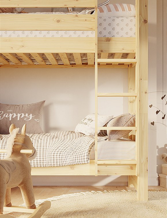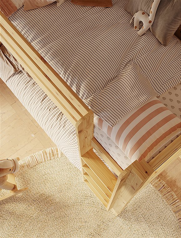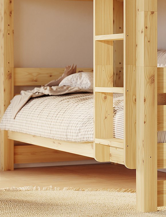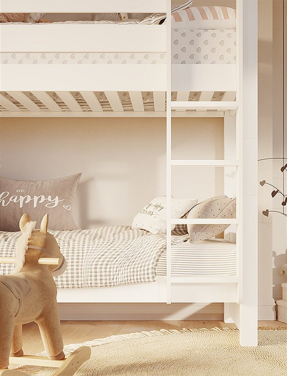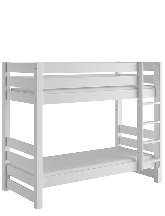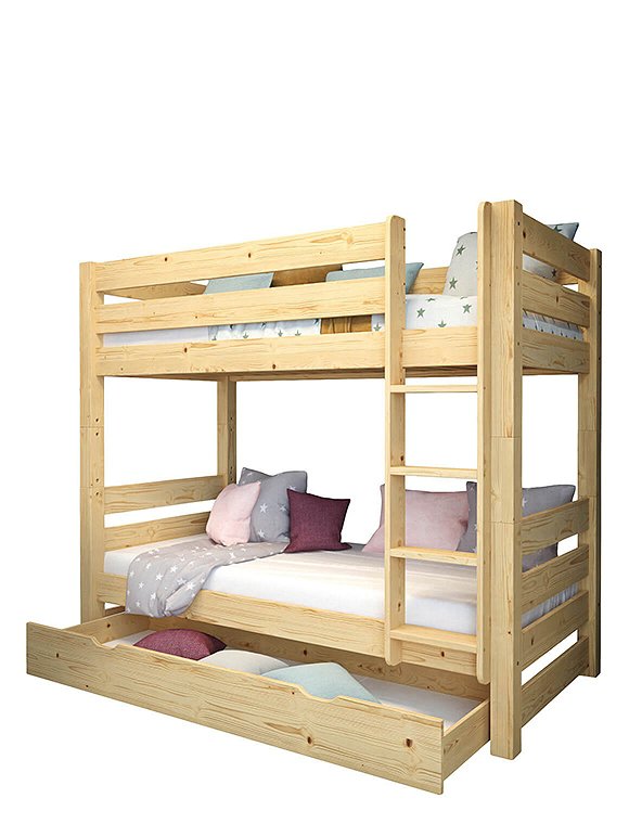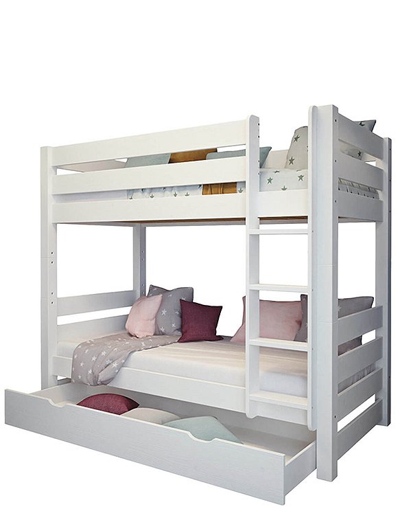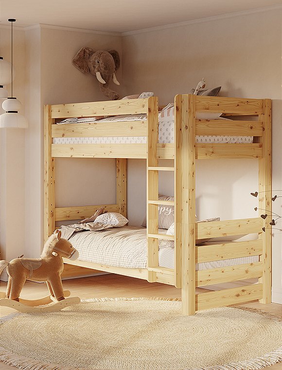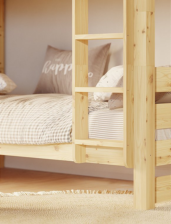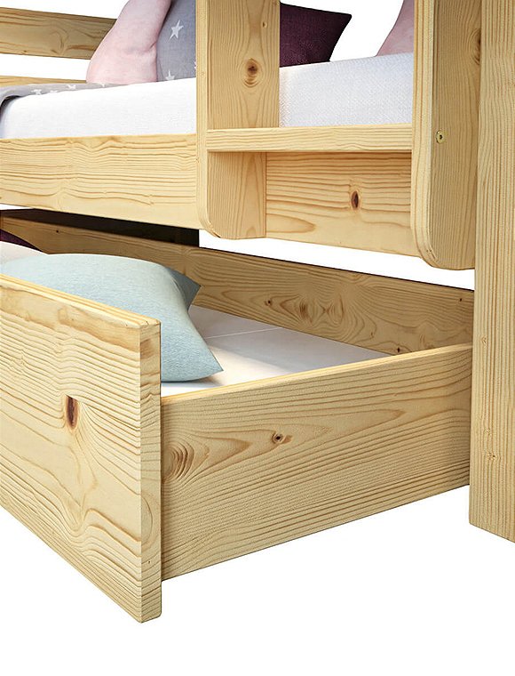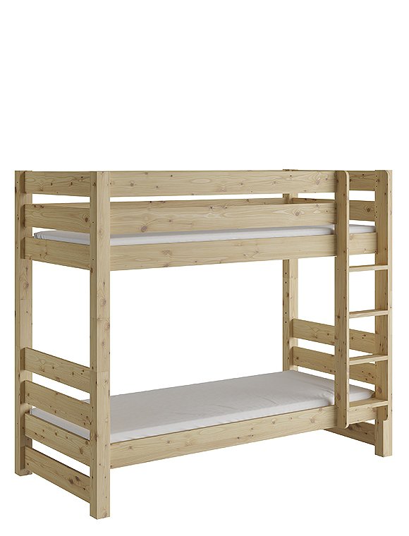 Schöner Schlaf und endlose Träume! Entdecke ultimative Flexibilität mit dem Etagenbett aus Kiefer - dass sich ganz leicht in zwei Einzelbetten umbauen lässt. Damit ist es ideal für heranwachsende Geschwister die sich ein Zimmer teilen - es ist ein Möbelstück, das mit den Kindern mitwächst und viele, viele Jahre lang genutzt werden kann, ohne dass es dabei an Ästhetik und Funktionalität einbüßt. Dank stabiler Geländer und verstellbarer Leiter (kann rechts und links angebracht werden), verspricht es ein hohes Maß an Sicherheit und Komfort. Robust und stilvoll ist das Holzbett inklusive Lattenrost mit dem Maß ca. 178 x 100 x 210 cm und jeweils einer Liegefläche von 90 x 200 cm - wer noch Staufläche benötigt bestellt einfach noch eine Schublade zum Bett dazu. Es ist Dank seiner massiven Konstruktion eine clevere Wahl für wachsende Familienbedürfnisse. Das Etagenbett aus Kiefer ist in natur farblos- und in weiß lackiert erhältlich - hab viel Spaß damit.