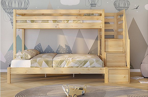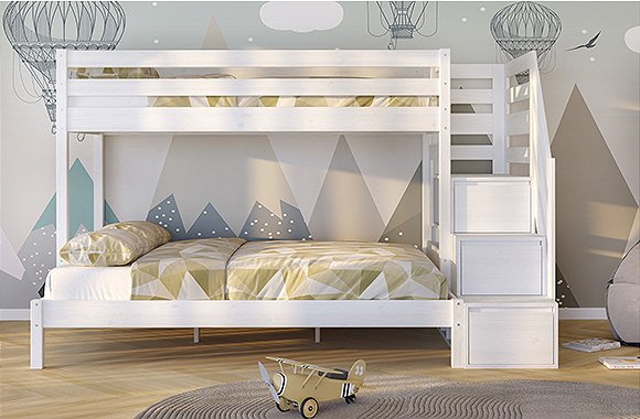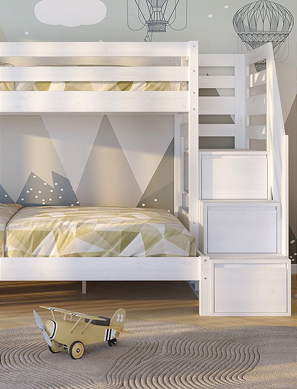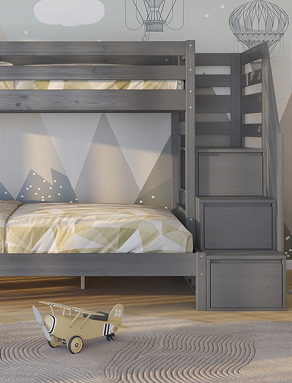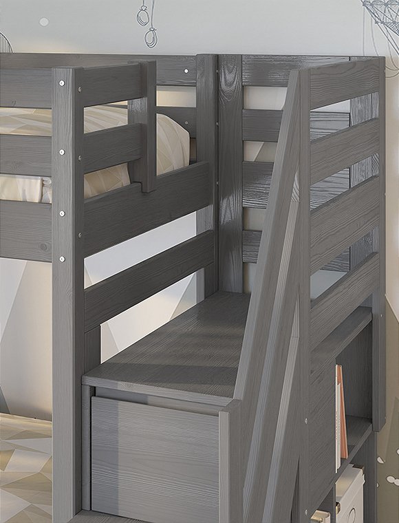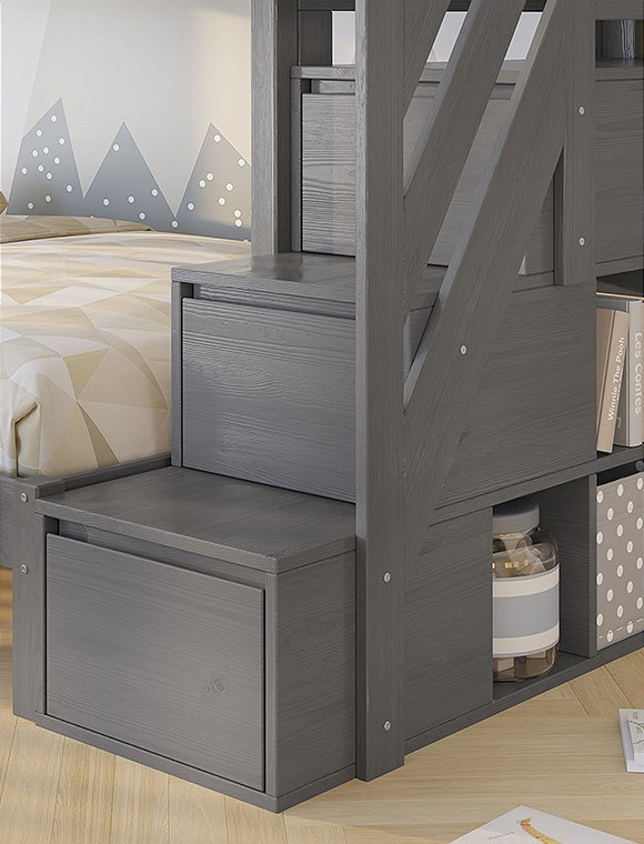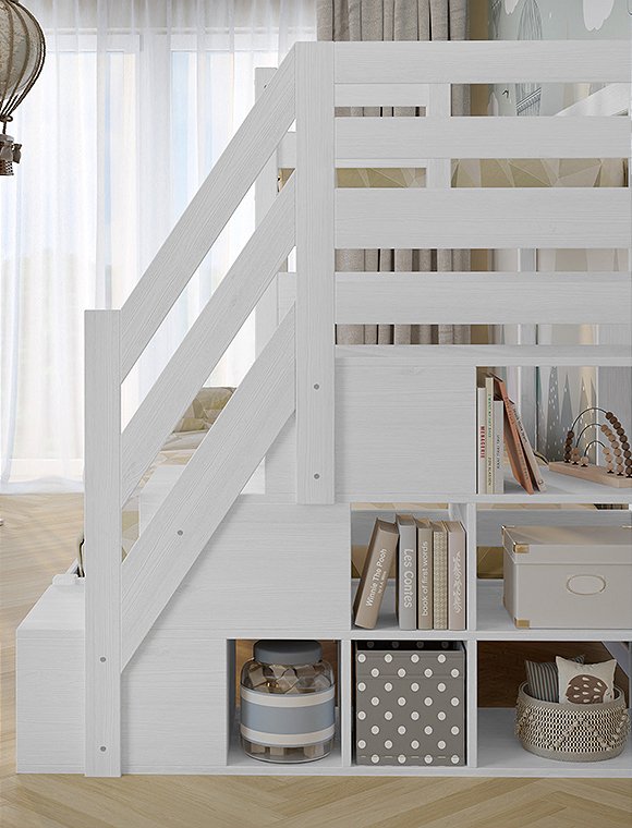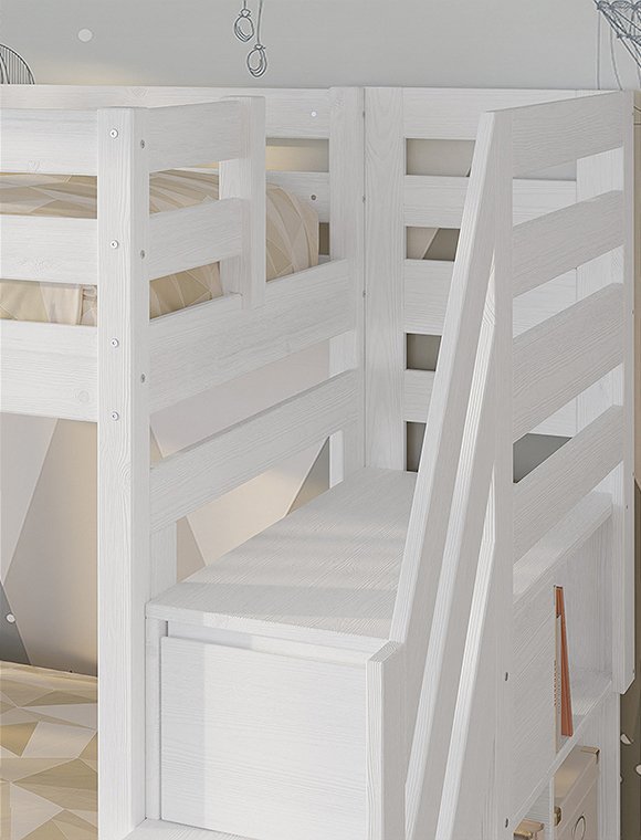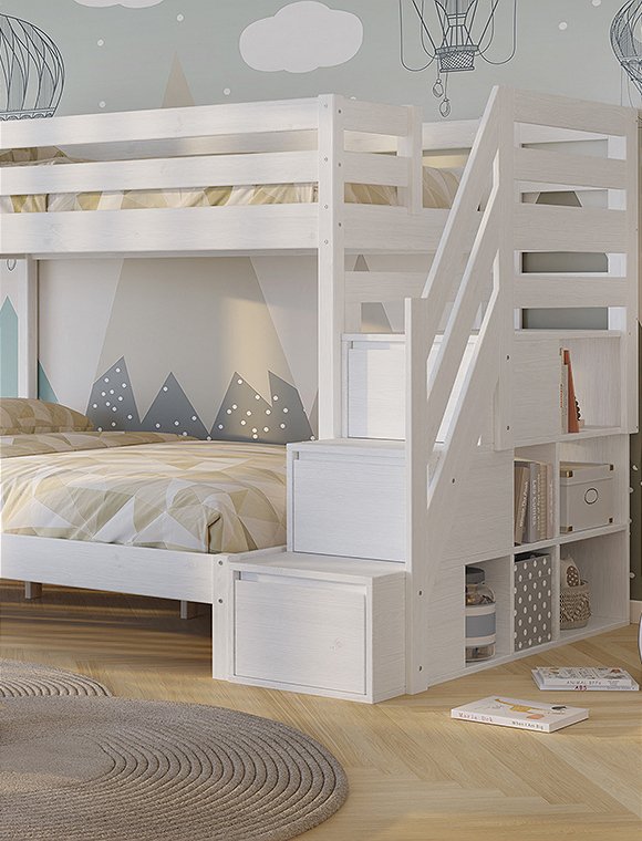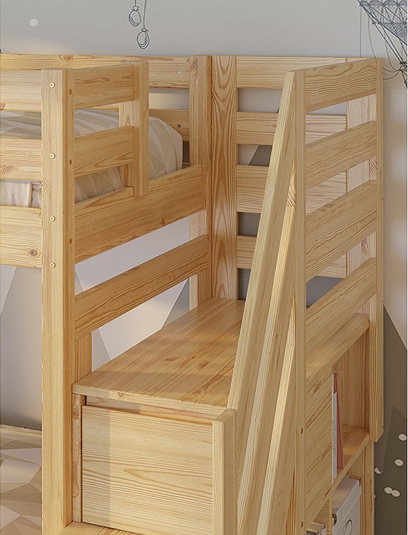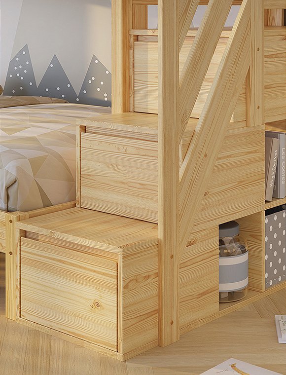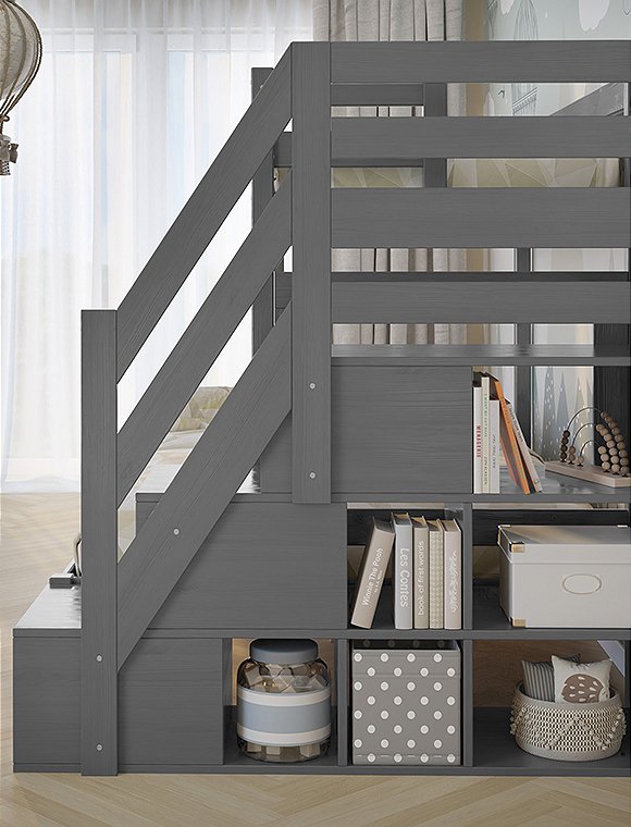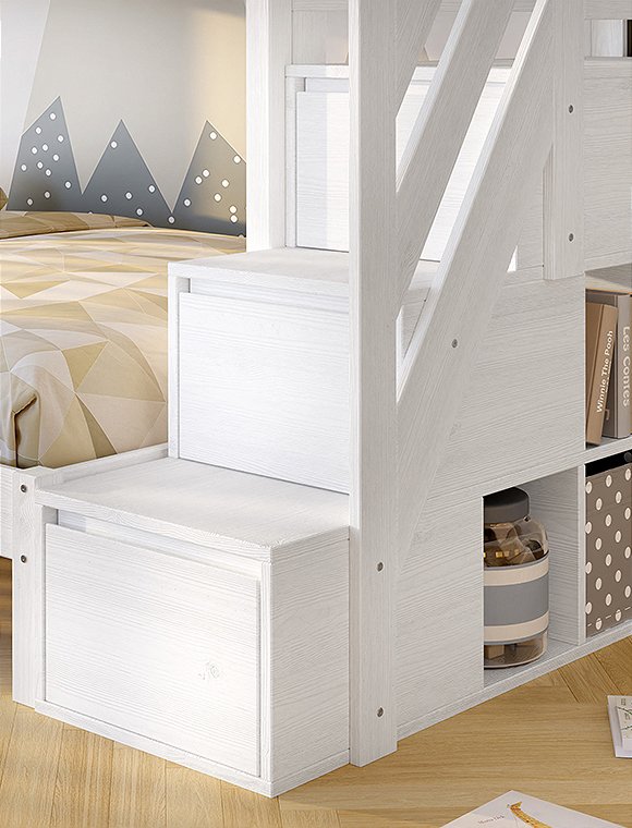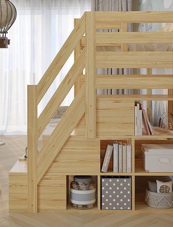Dieses Etagenbett hat Stauraum und eine breite Liegefläche unten - Platz für zwei Personen auf 140 cm - und eine 90 cm Breite Matratze oben. Es eignet sich für drei Personen und ist ideal für kleine Räume und perfekt wenn deine Kinder Übernachtungsbesuch bekommen. Oder für dein kleines Ferienhaus, wenn du viele, viele Gäste oder deine dreiköpfige Familie unterbringen möchtest:). Das praktische wie schöne Bett aus Kiefernholz ist solide verarbeitet und gewährleistet Stabilität und Langlebigkeit. Es bietet dir unter den Stufen in den Schüben viel Platz für Spielzeug, Kleidung oder Decken - in den offenen Fächern finden Bücher und Lieblings-Kuscheltiere ihren Platz. Das hübsche Holzbett ist eine großartige Lösung für Geschwister - gerade wenn eins der Beiden schon etwas älter ist. Beide Betten können auch einzeln gestellt und genutzt werden - dann bietet das Hochbett Platz für einen Schreibtisch darunter. Der natürliche, farblos lackierte Farbton kann in jedem Innenraum eine entspannende Atmosphäre schaffen, weiß oder grau lackiert bietet dir etwas mehr modernität. Das Etagenbett mit Stauraum ist in natur farblos- in weiß oder grau lackiert erhältlich - hab viel Spaß damit.