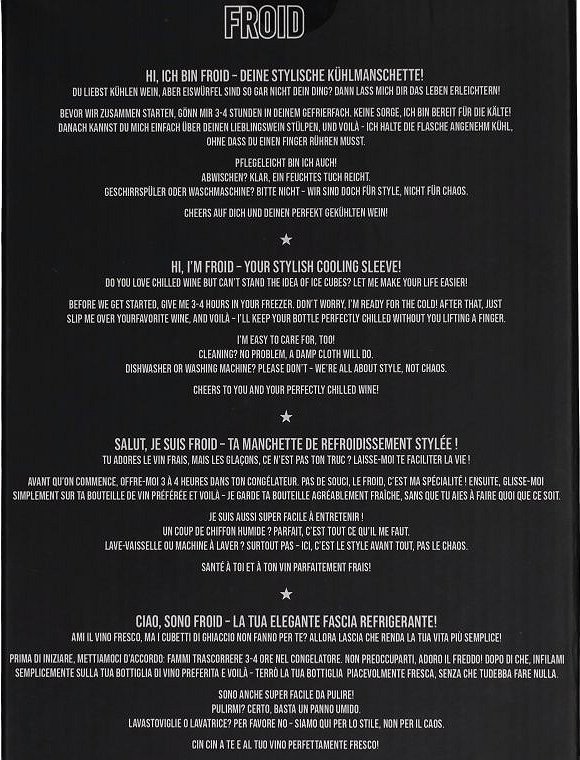 Die Froid Kühlmanschette von GiftCompany hält alles schön kalt. Es stehen dir vier unterschiedliche Farben und Varianten zur Auswahl - Cheers, Streifen, Fische mit Meerjungfrau oder der gute alte Hummer. Die Manschetten bestehen aus 90% Gel und 10% Polyester und lassen sich platzsparend im Eisfach vor Gebrauch deponieren. Die Manschette wird unten geöffnet und einfach über die Flasche gezogen - fertig. So ist der Kühler für Terrasse oder Ausflug ein must have für den Sommer. Du möchtest eine Flasche Wein mitbringen? Dann ist die Manschette eine prima Verpackung! Genieße die kühlen Drinks mit der Froid Kühlmanschette von GiftCompany.Details: