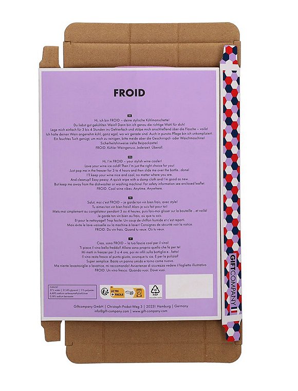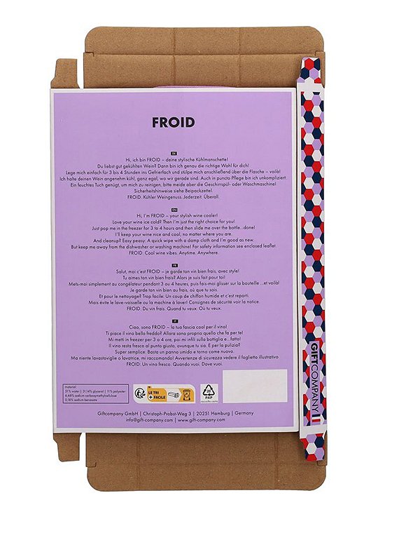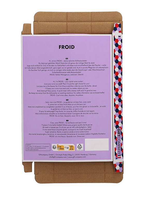 Die Froid Kühlmanschette von GiftCompany hält alles schön kalt. Es stehen dir viele süße Designs zur Auswahl - Cheers, Streifen, Fische mit Meerjungfrau, ein neon Hummer, Ice Ice Baby, Thank you Darling und viele andere mehr. Die Manschetten bestehen aus 90% Gel und 10% Satin und lassen sich platzsparend im Eisfach vor Gebrauch deponieren. Die Manschette wird unten geöffnet und einfach über die Flasche gezogen - fertig. So ist der Kühler für Terrasse oder Ausflug ein must have für den Sommer. Du möchtest eine Flasche Wein mitbringen? Dann ist die Manschette eine prima Verpackung! Genieße die kühlen Drinks mit der Froid Kühlmanschette von GiftCompany.Details: