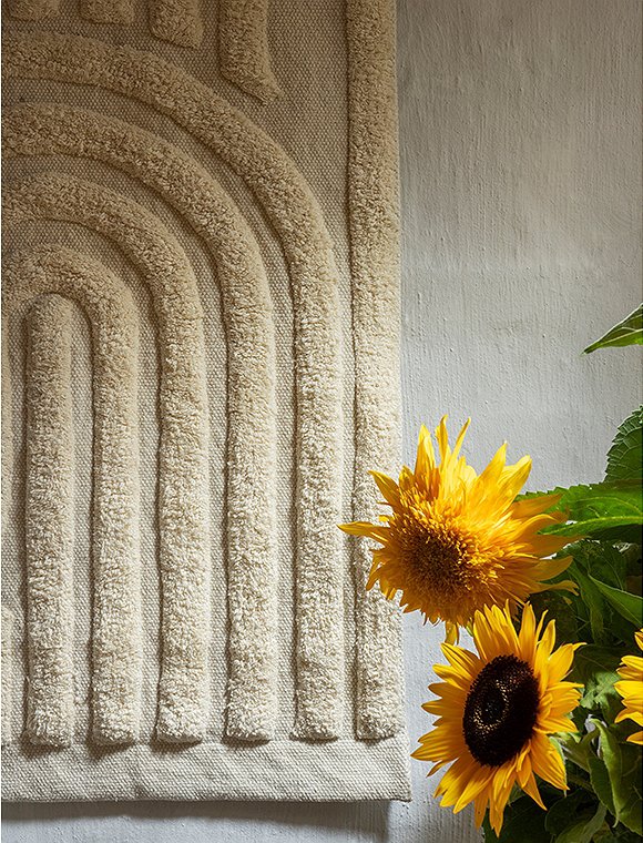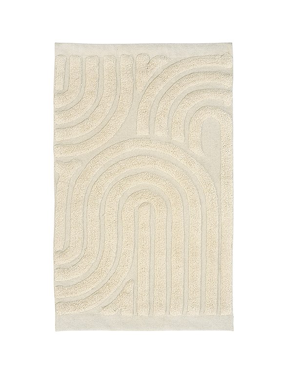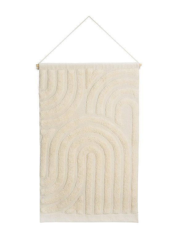 Getuftete Wanddekoration von Madam Stoltz für warme, bohemische Wände. Dieser getuftete Wandbehang besteht aus weichem Baumwollflor mit stabilisierender Latex-Rückseite und einem schlichten Holzstab zum Aufhängen. Die Vanillefarbe sorgt für einen dezenten Look und lässt sich gut mit Naturmaterialien, gedeckten Textilien und klaren Linien kombinieren. Jedes Stück ist sorgfältig getuftet, wodurch ein haptisches Muster entsteht, das man sehen und fühlen kann. Die Baumwollfasern fühlen sich angenehm weich an, egal ob man sie mit den Händen oder nackten Füßen berührt. Der Holzstab kann entfernt werden, wenn Sie den Wandbehang flach auslegen und ihn als praktische, saugfähige Badematte verwenden möchten. Der Teppich ist 100 x 60 cm groß. Der Getuftete Wanddekoration von Madam Stoltz ist ein vielseitiges und gut zu kombinierendes Textil, das harte Oberflächen weicher gestaltet und Geräusche dämpft.Details: