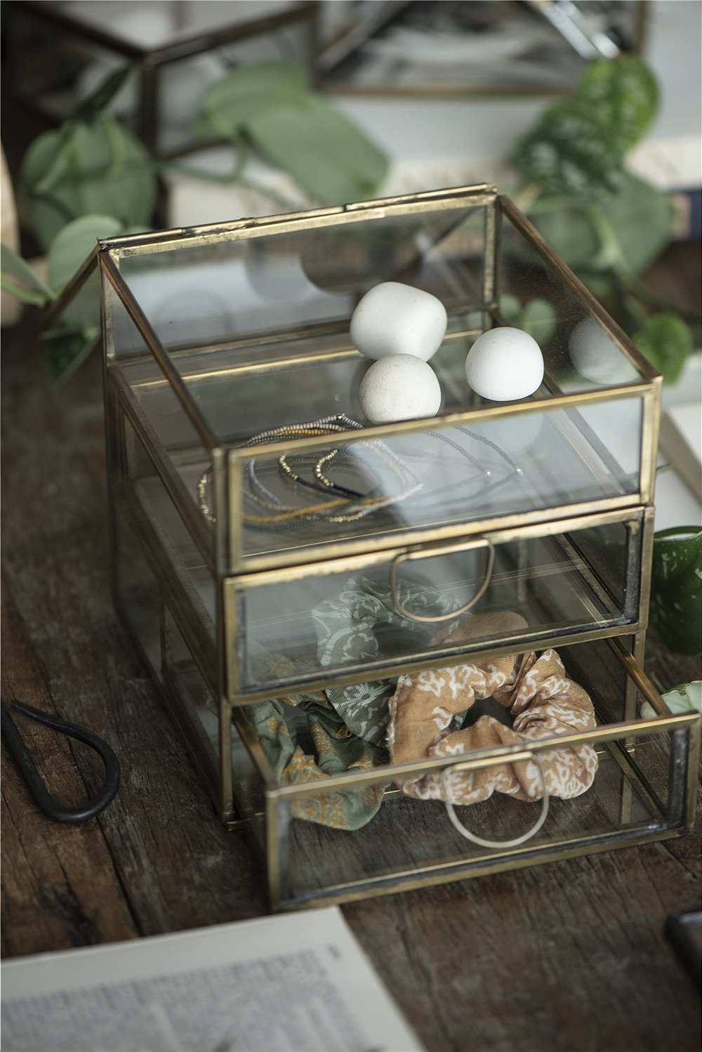 Elegante Aufbewahrung. Die Glasbox mit Schüben und Deckel von Ib Laursen macht sich in vielen unterschiedlichen Bereichen des Zuhauses ganz wunderbar. Als Aufbewahrungsutensil genutzt, überzeugt das elegante Modell auf Schreibtischen, Schminktischen, in Schlafzimmern oder kann für Hobbyzwecke eingesetzt werden. Hierbei stehen dir zwei Schiebefächer zur Verfügung und ein Fach ganz oben, auf welches du durch den aufklappbaren Deckel ganz leicht zugreifen kannst. Alle drei Fächer haben dieselbe Höhe, wobei das Gesamtformat des Glaskubus 15,5x15,5x15,5 cm beträgt. Die Kanten wurden aus Messing gefertigt, die mit einem antiken Goldton versehen sind und die Glasbox mit Schüben und Deckel von Ib Laursen zu einem edlen Blickfang machen!Details: