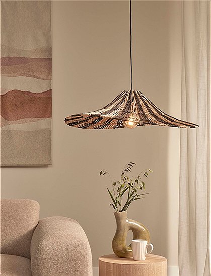 Sehr dekorativ! Hängeleuchte Cuzco von GOOD & MOJO. Inspiriert von den fließenden Flüssen der Region Cuzco, bringt die organisch geformte Hängelampe die natürliche Schönheit von Jute in deinen Raum. Mit ihrem sanft gewellten Design strahlt dieses Stück ein warmes, einladendes Licht aus - das perfekt über deinen Esstisch passt. Die Cuzco-Lampe sorgt für eine gemütliche, einladende Stimmung in der tolle Gespräche und köstliche Mahlzeiten entstehen. Genieße die schöne Mischung aus Design und Nachhaltigkeit. Die Hängeleuchte des niederländischen Labels besticht auch durch ihre mutige Größe. Mit einem Durchmesser von 65 cm ist Cuzco immer eine tolle Dekoration. Der Lampenschirm hat ein dekorativ geflochtenes Streifenmuster in schwarz/natur - und ist ein echter Hingucker in deinem Appartement. Unser Tipp: Wähle ein dekoratives Leuchtmittel mit hübschen Glühfäden - denn es ist sichtbar. Bitte beachte, dass kein Leuchtmittel im Lieferumfang enthalten ist. Die Hängelampe wird mit einem Baldachin aus schwarzem Metall (4xØ11 cm) an der Decke montiert und hat ein 200 cm langes schwarzes Textilkabel. Für jede verkaufte Lampe pflanzt GOOD & MOJO einen Baum. Denn das nachhaltige moderne Label unterstützt bereits seit mehreren Jahren die Eden Reforestation Projects, eine gemeinnützige NGO, die in Entwicklungsländern daran arbeitet, durch Abholzung zerstörte Naturlandschaften wieder aufzubauen. Bringe Wärme, Gemütlichkeit und Charme in dein Zuhause und dekoriere deine vier Wände mit der dekorativen Hängeleuchte Cuzco von GOOD & MOJO.