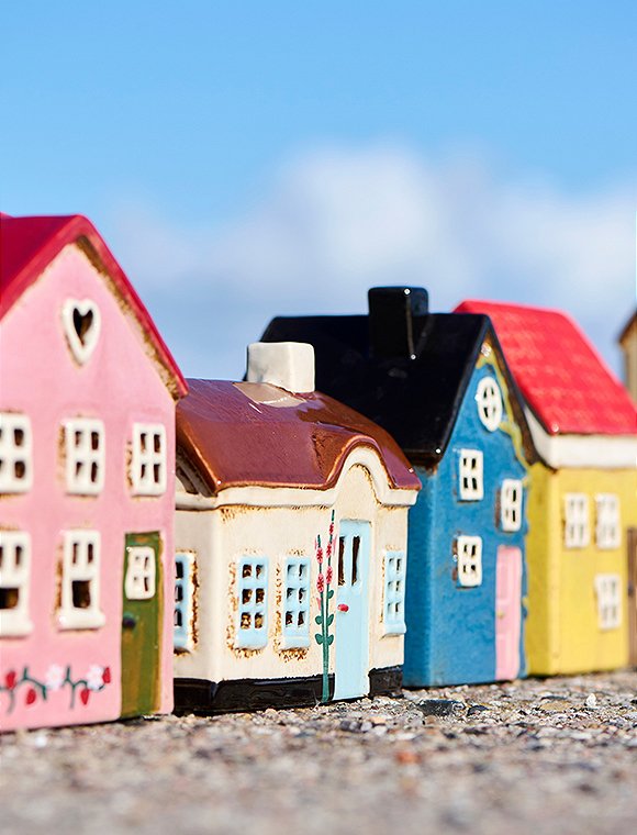Beim Glasieren von Keramik herrscht immer ein gewisses Maß an Unvorhersehbarkeit, und während des Brennens werden die Farben lebendig. Genau das verleiht den kleinen Häusern ein einzigartiges und originelles Aussehen, mit kleinen Farbunterschieden und rustikalen Kanten. Nicht für die Spülmaschine geeignet.