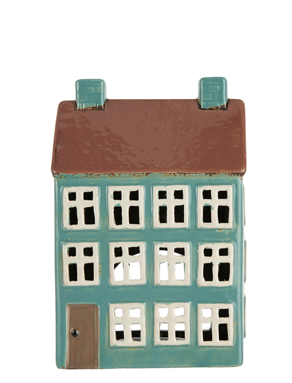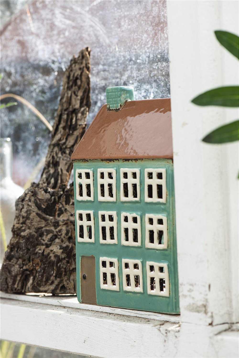 Willkommen in Kopenhagen! Mit dem Haus Nyhavn für Teelichter von Ib Laursen zieht ein Hauch der dänischen Hauptstadt bei dir zuhause ein. Denn die wunderschön bemalten Häuser aus Keramik erinnern uns total an die typischen bekannten Häuserfronten in dem Hafen Stadtteil "Nyhavn". Abwechselnd bunt aneinandergereiht stehen die hübschen Gebäude in blau, gelb, rot mit den klassischen weißen Fensterrahmen und Sprossen dort. Manche haben einen Schornstein, manche sogar zwei, wieder andere gar keinen. Du kannst zwischen vielen unterschiedlichen Modellen, die sich in Farbe, Form und Größe unterscheiden, wählen. Besonders hübsch sehen mehrere Keramikhäuser nebeneinander aus. Die Teelichter oder auch kleine Lichterketten lassen sich dank der runden Aussparung ganz einfach und unkompliziert von hinten in die Keramikgefäße reinstellen. Werden sie angezündet, erleuchten sie die Fassaden mit einem wunderschönen Lichterglanz. Aber auch bei Tag sind die dekorativen Häuser ein absoluter Blickfang auf jedem Wandregal, der Fensterbank oder auf der Kommode im Wohnraum. Kreiere mit dem Haus Nyhavn für Teelichter von Ib Laursen deinen ganz persönlichen kleinen Mini Stadtteil und fühle dich wie in Dänemark.