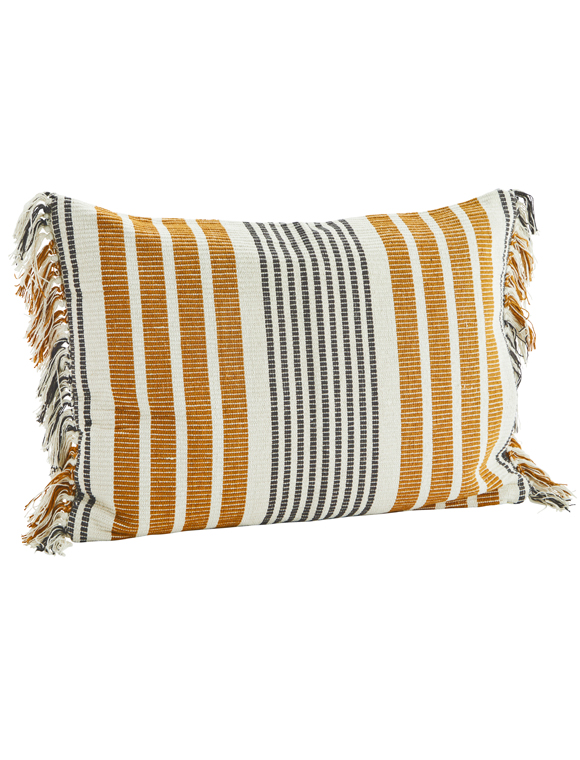 Schöne, große Kissen mit Streifen und Fransen von Madam Stoltz. Der süße Streifen erinnert ein bisschen an Matratzendrell - die Farben allerdings sind hier frisch und Kontrastreich gewählt und bieten dir eine frische Option für Schlaf-, Wohnzimmer und Balkon. Die schönen Streifenkissen gibt es in drei wunderschönen Farben - es stehen grün, senfgelb und blau gestreift mit offwhite und dunkelgrau zur Auswahl. Die Bezüge sind aus 100% Baumwolle gewebt, haben einen Reißverschluss und können bei 30 Grad in der Maschine gewaschen werden. Die Kissen lasen sich prima kombinieren und sind so schön groß, dass sie für eine breite Bank oder einem Daybed ein bequemes Sofakissen sind. Wir wünschen dir viel Spaß und gemütliche mit dem Kissen mit Streifen und Fransen von Madam Stoltz.Details:
