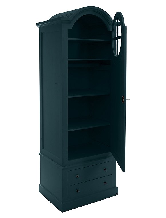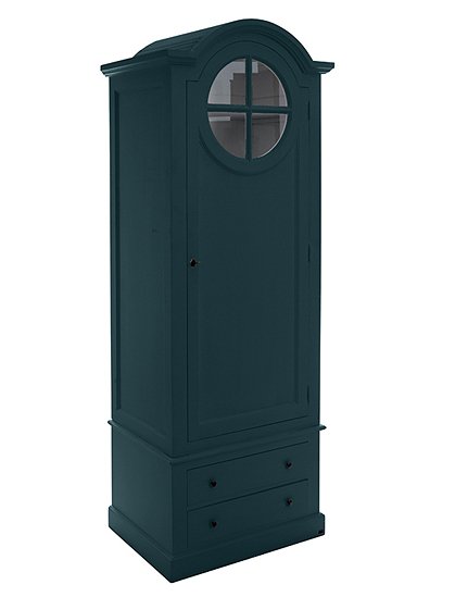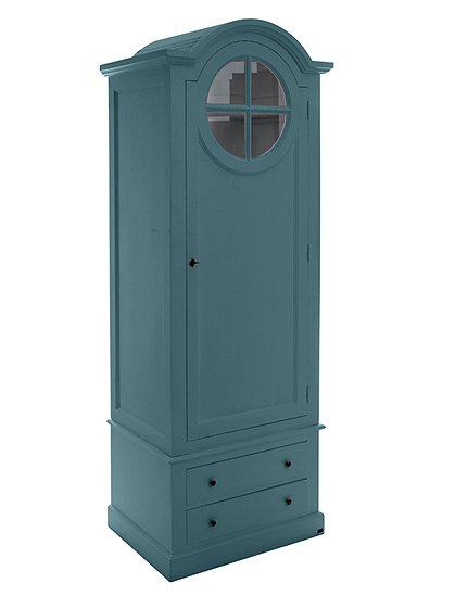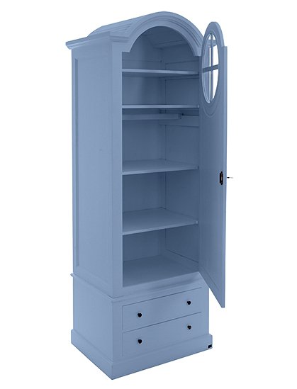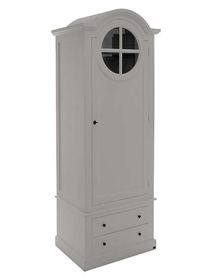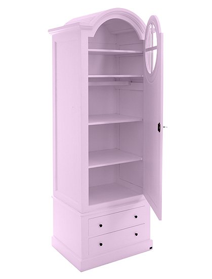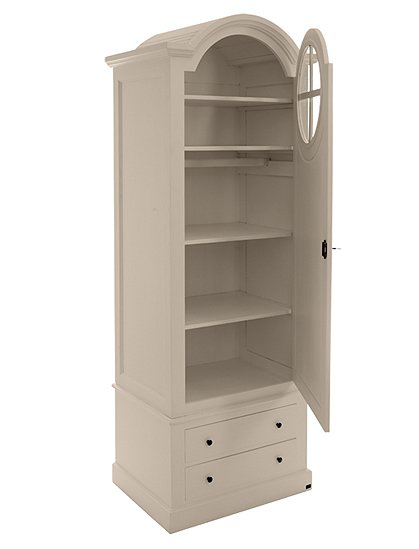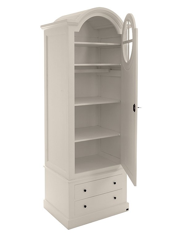 Dieser wunderschöne Kleiderschrank aus Massivholz ist aus gestrichener Kiefer im Landhausstil gefertigt und wir bietem ihn dir in 15 super schönen Farben an. Seine aufwendig gearbeitete Form mit dem charmanten Schwung oben fällt dir bestimmt sofort ins Auge. Besonderes Highlight ist die kreisrunde Aussparung mit aufgesetzten Sprossen im oberen Bereich der Tür, die einen leichten Einblick in den Schrank erlaubt und somit den Blick auf alle schönen Sachen zieht. Im Unterteil gibt es zwei geräumige Schubladen für vielerlei Wäsche. Hinter der abschließbaren Tür vom Oberteil können Sie die Ausgestaltung des Schranks vornehmen, wie Sie wünschen. Im Lieferumfang enthalten sind eine Kleiderstange sowie vier lose Einlageböden. Entscheide selbst, ob du den Schrank nur mit Fächern oder auch für Kleidung zum Aufhängen ausstatten möchtest. Natürlich kann die Kleiderstange auch mit ein oder zwei Regalböden kombiniert werden. Das Modell wird fertig montiert in zwei Teilen geliefert, damit du den Schrank problemlos an deinen Wunschort transportieren kannst. Bringe mit diesem schönen Kleiderschrank einen Hauch von Landhaus in dein Appartement und freue dich über die ganze Flexibilität.