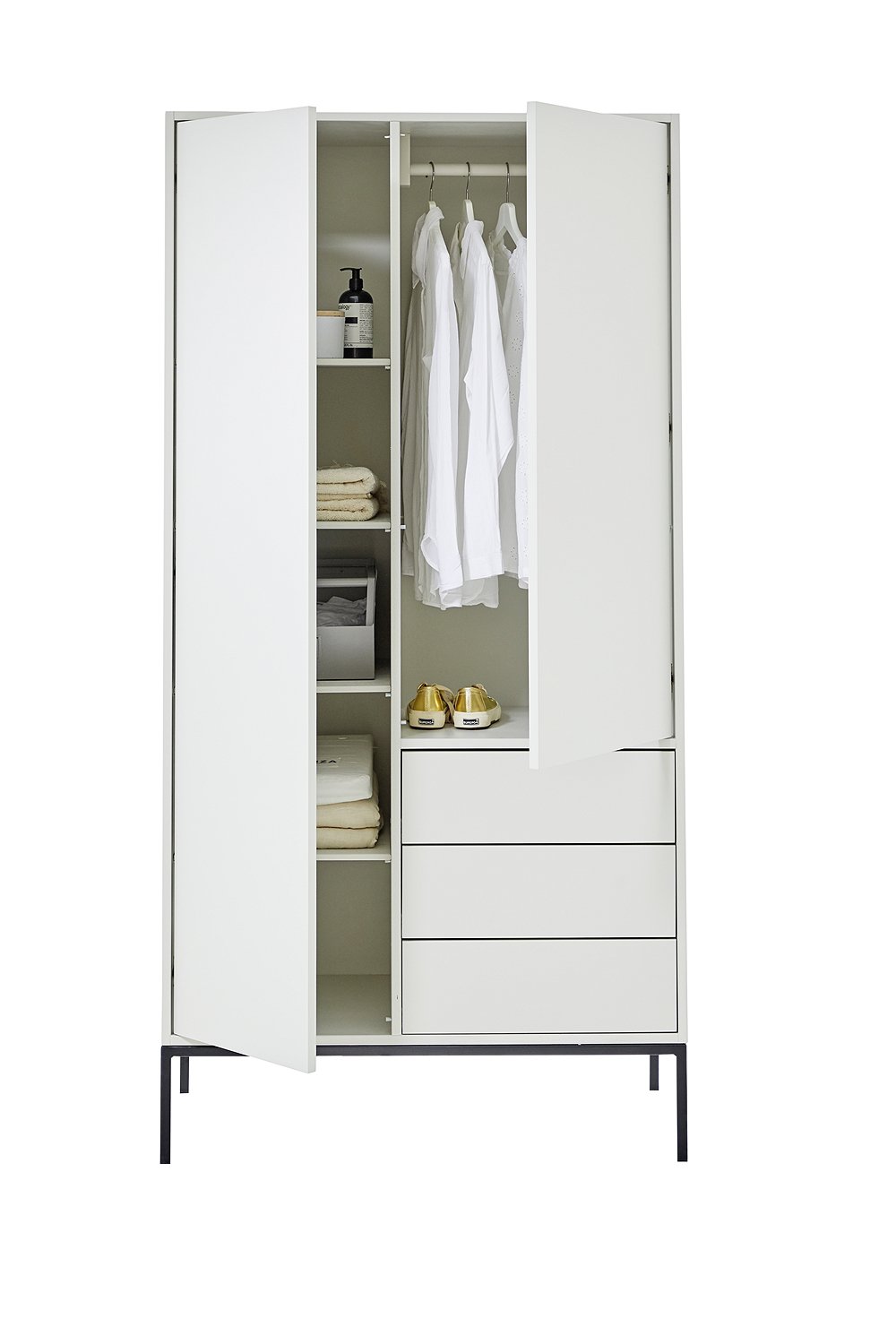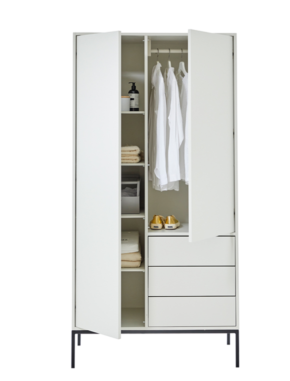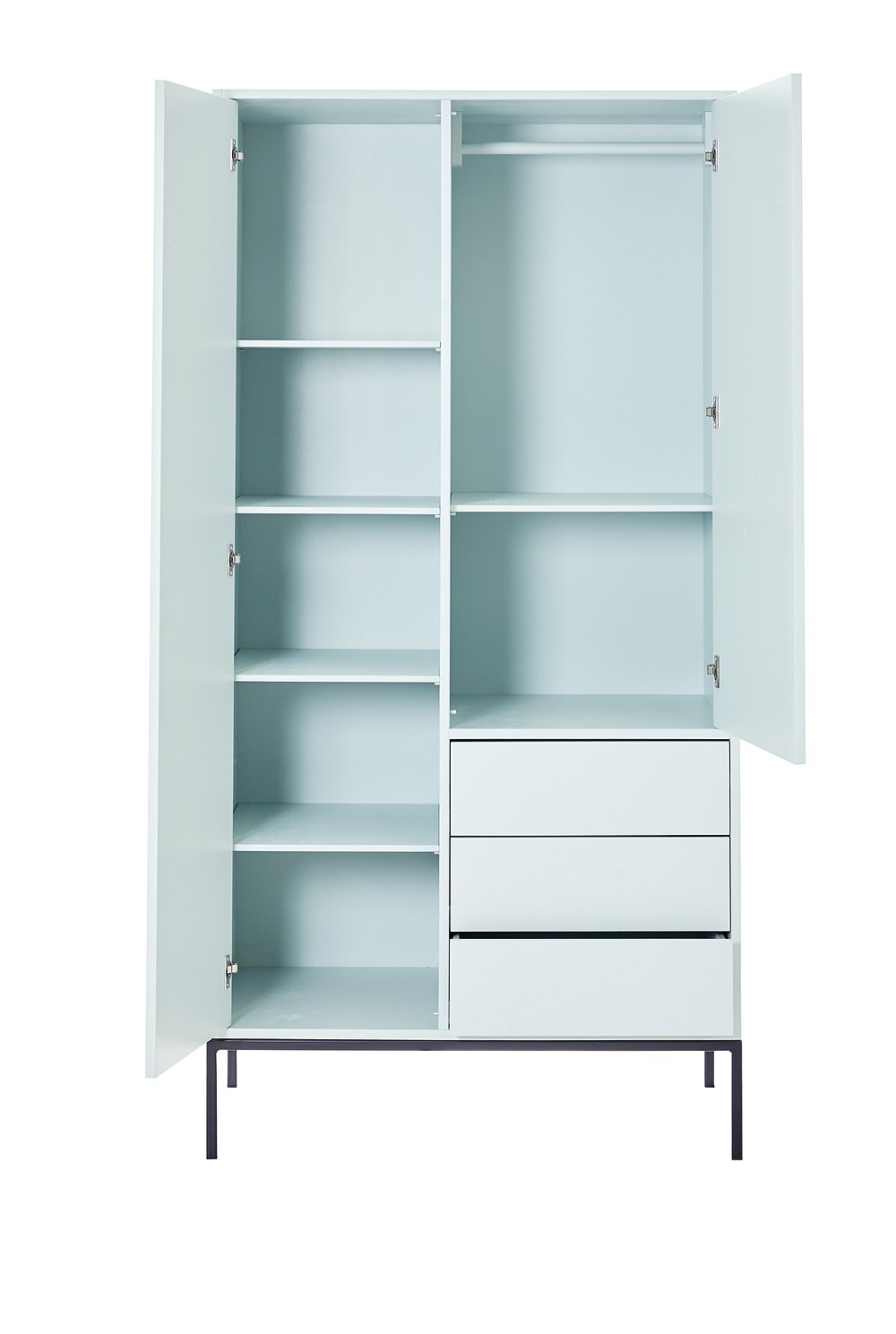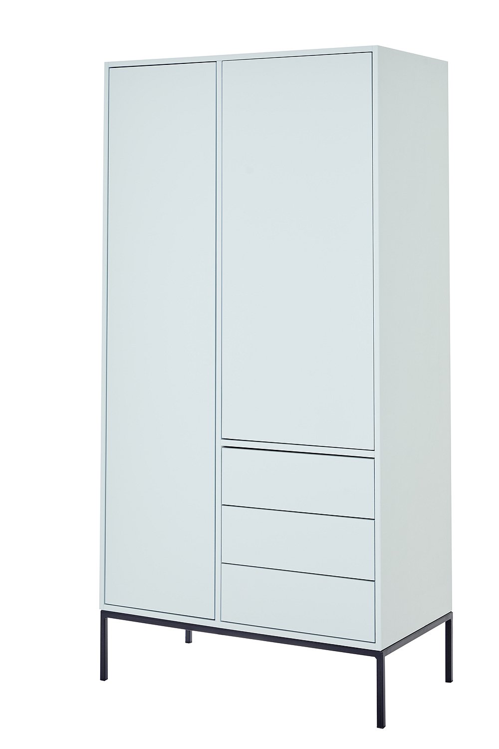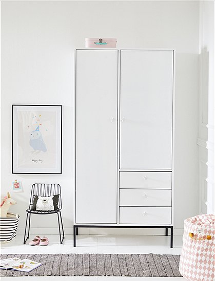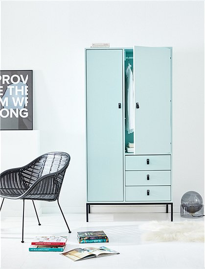 Toller Kleiderschrank aus MDF mit drei praktischen Schubladen. Der hübsche Schrank im Loft-Style passt perfekt ins moderne Kinderzimmer und wächst vom Baby- bis ins Teenageralter ganz einfach mit. In vier unterschiedlichen Farben ist der lackierte Holzschrank erhältlich - weiß, hellgrau, Vespa grün und anthrazit - besonders schön setzt sich dabei der Sockel in Metall ab. Die Schubladen und Türen sind mit geräuschlosen, selbstschließenden Blumführungen und Scharnieren ausgestattet - so bleibt mit den soft close Beschlägen alles schön leise und besonders leichtgängig. Die Innenausstattung ist so aufgeteilt das alle Kleider eines Kindes hinein passen - d.h. hinter der linken Tür befinden sich verstellbare Regale (4 Einlegeböden), hinter der rechten Tür eine Kleiderstange und ein Einlegeboden. Der süße Kinderschrank ist Teil der neuen Kinder-Kollektion die aus einem Jugendbett, einem Regal und einem weiteren Schrank besteht. Die gesamte Serie ist aus hochwertigem MDF gearbeitet und wird ausschließlich in Europa gefertigt. Der solide Kleiderschrank aus MDF wird ohne Griffe und Bohrungen geliefert (eine große Auswahl an Griffen finden Sie hier), und kommt fertig montiert (nur der Metallsockel muss noch drunter geschraubt werden), zu Ihnen nach Hause - wir wünschen Ihnen viel Spaß beim Einräumen.