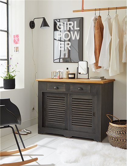 Sieht toll aus! Praktische Kommode mit Lamellentüren und Schubladen mit einer wunderschönen Ablage aus Teak. Die schöne Holzkommode gibt es in zwei unterschiedlichen Größen und Farben - so ist für jeden Geschmack etwas dabei. Besonders spannend wirkt die Ablage mit modernen Elementen - prima, dass man sie in jedem Raum gebrauchen kann. Schön also für Küche, Bad, Flur oder Arbeitszimmer und im Nu findet alles seinen fein sortierten Platz. Große Dinge verschwinden hinter den leichtgängigen Schiebetüren, die kleine Dinge finden in den beiden Schüben ihren Ort. Die praktische Kommode mit Lamellentüren ist in schwarz oder hellgrau gestrichen erhältlich und wird montiert versendet - sie kann also wirklich sofort eingeräumt werden - wir wünschen viel Spaß dabei!