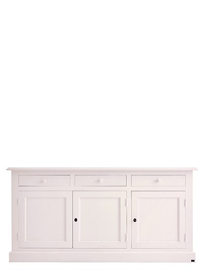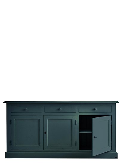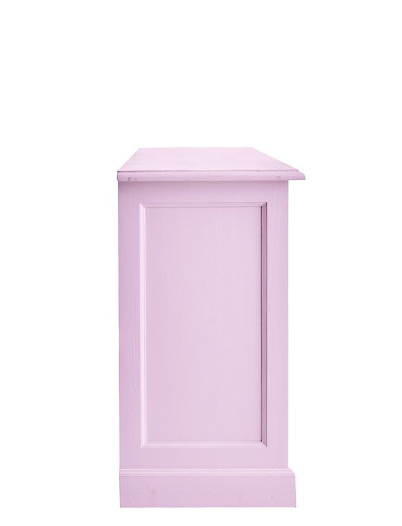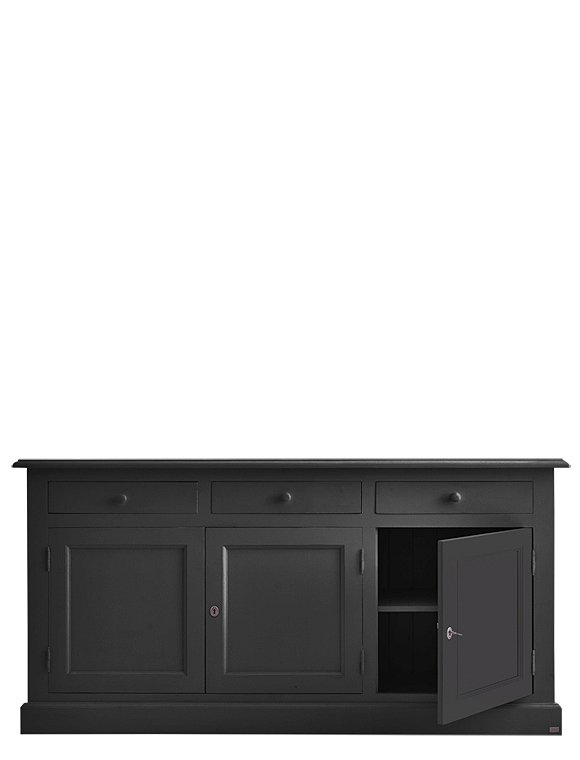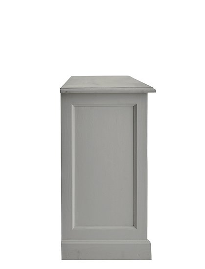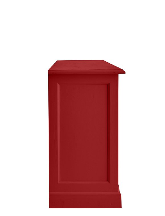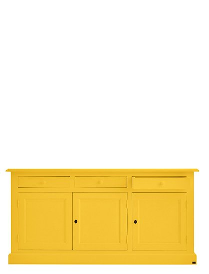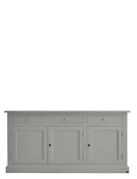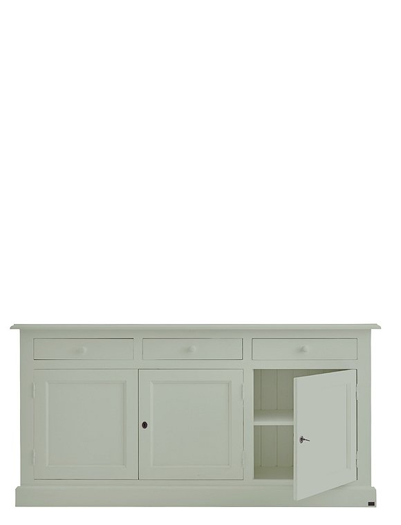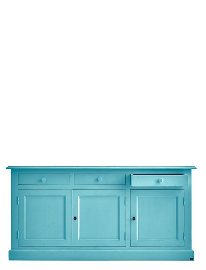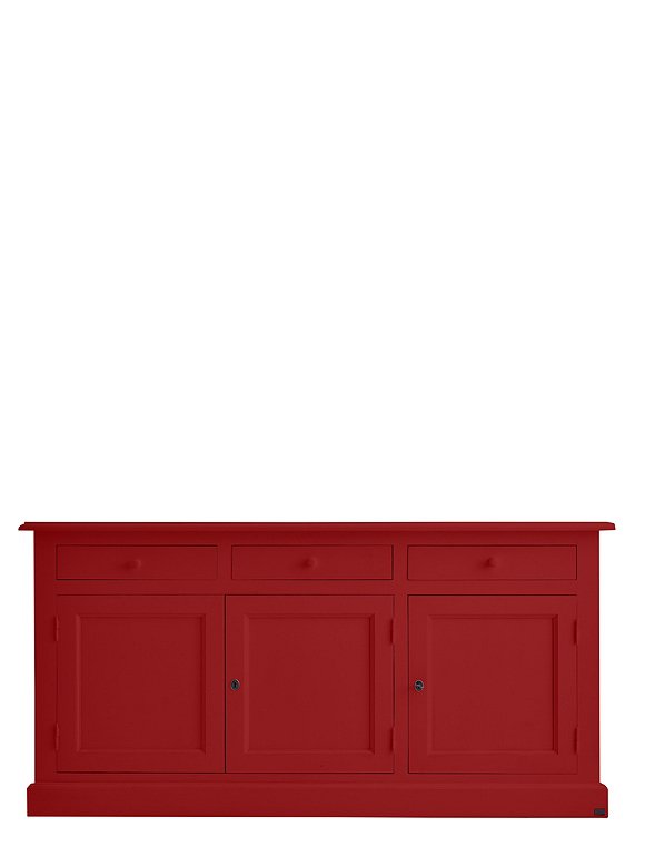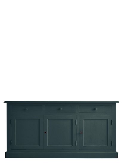 Jede Menge Ordnung schafft die schöne klassische Kommode mit drei Türen und drei Schubladen. Das Modell ist in 15 Farben lackiert (sichtbarer Pinselstrich) erhältlich und aus massiver Kiefer gefertigt. Die traditionell gearbeiteten Kassettentüren (eine einzelne und eine Doppeltür) werden mit einem kleinen Schlüssel geschlossen und verleihen dem Sideboard seinen Landhauscharakter. Hinter den Türen verbergen sich zwei Fächer (je 30x40,5x169 cm) über die gesamte Breite des Schrankes. Hier finden vielerlei Küchen- und Arbeitsutensilien, Geschirr, Tischwaren und vieles andere mehr Platz. Kleinere Dinge wie Servietten, Kerzen, Besteck finden in den drei Schubladen (8,5x37,5x45,5 cm) mit den süßen Holzgriffen Platz. Und das Beste: Du gewinnst mit dem langen Sideboard obendrein eine schöne Dekorationsfläche für deine liebsten Accessoires. Bilderrahmen, Vasen, Tischleuchten, Kerzenhalter und Windlichter können hier hübsch angeordnet ausgestellt werden und deiner Einrichtung eine ganz individuelle Note verleihen. Die Kommode mit Türen und Schubladen wird fertig montiert geliefert. Wir wünschen viel Freude beim Einräumen. Bitte beachte, dass alle bunten Farben (ausgenommen weiß), eine Sonderanfertigung für dich sind - und somit vom Umtausch ausgeschlossen.