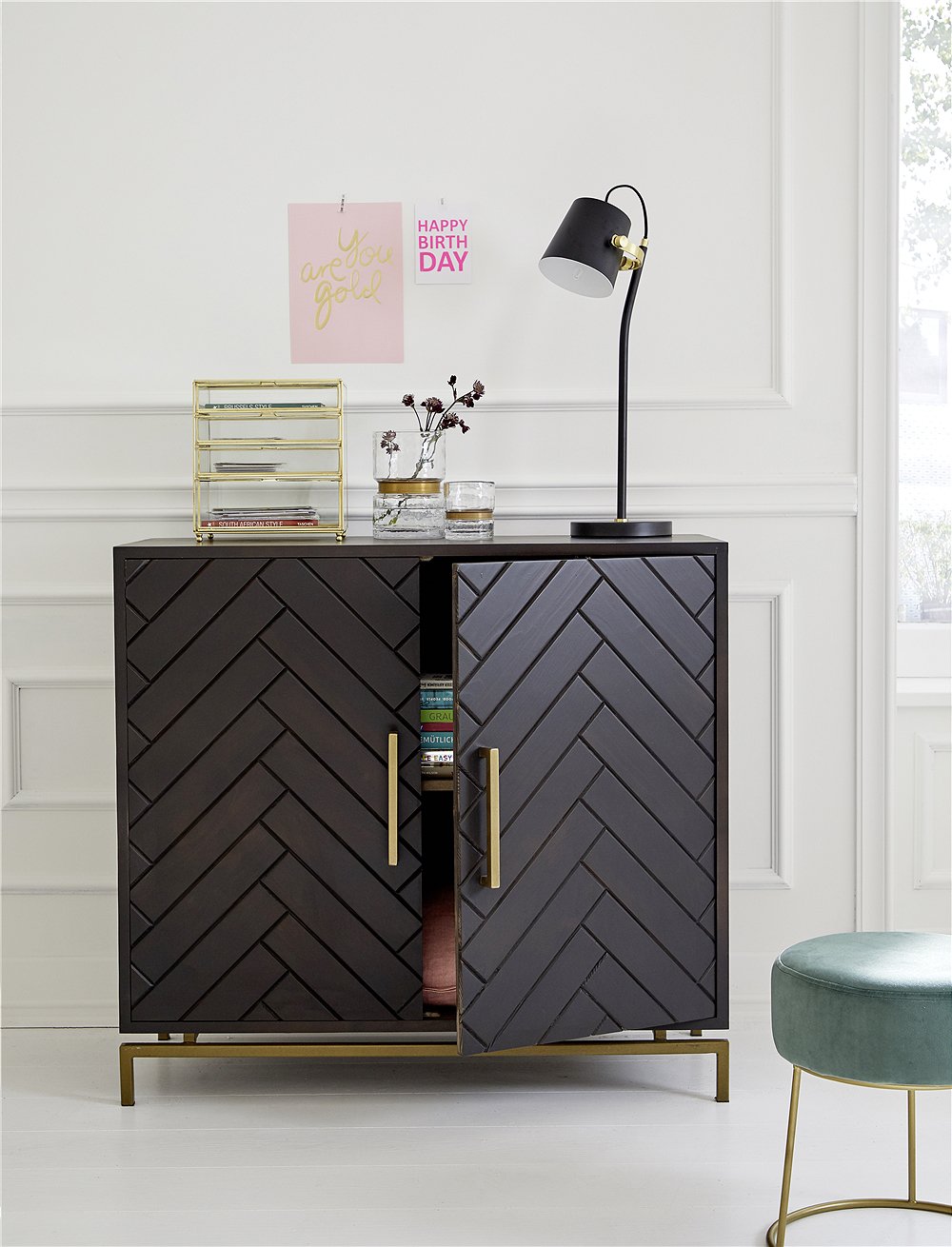Passt perfekt in Wohn-, Ess- und Schlafzimmer! Die Kommode mit Wenge finish sieht super edel aus und lässt sich dabei ganz selbstverständlich mit vielen unterschiedlichen Wohnstilen kombinieren. Ton in Ton mit dunklen Hölzern oder als bewusster Kontrast zu einem weißen, hellen Umfeld - die hübsche Kommode macht so ziemlich alles mit. Sie hat zwei wunderschöne Türen im Fischgrät Muster und ist in ihrem Inneren mit einem praktischen Einlegeboden ausgestattet. Bei einer Fachhöhe von 37 cm sortiert sie auch größere Gegenstände ganz, ganz schnell weg. Das edle Sideboard ist 92 x 45 x 100 cm groß, aus massivem Kiefernholz in Europa gefertigt und wird fix und fertig montiert geliefert. Das dunkle Wenge finish passt perfekt zu Sockel und Griffen - beides sehr schöne Messingdetails die in keinem modernen Haushalt mehr fehlen dürfen. Die Kommode mit Wenge finish ist eins unserer Lieblingsstücke aus der neuen exklusiven Car- Möbel Herbstkollektion - wir wünschen Ihnen viel Freude damit!