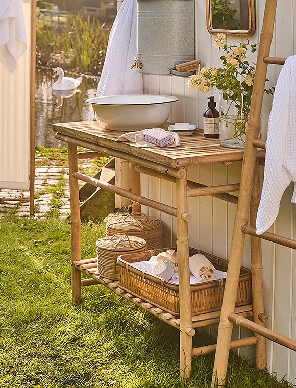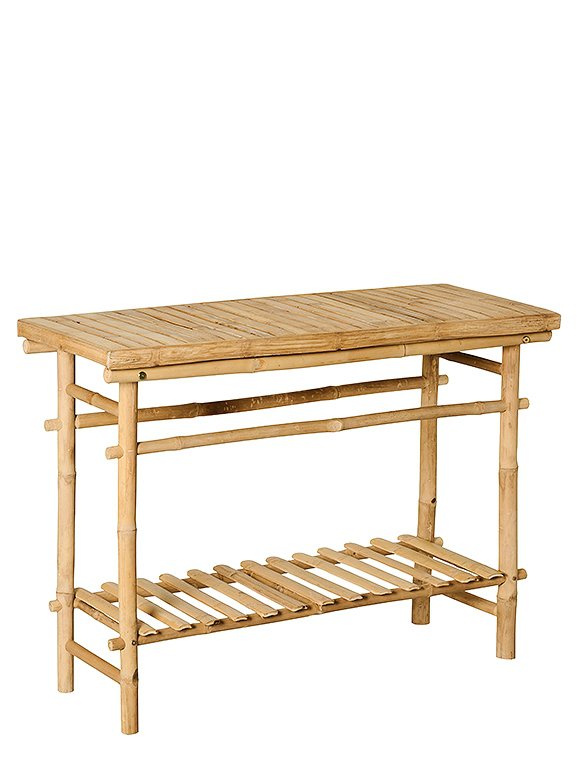 Mit dem Konsolentisch aus Bambus, 75x40,5x101,5 cm von Ib Laursen bringst du Leichtigkeit und Natürlichkeit in dein Zuhause. Das filigrane Design mit den charmanten Bambusstreben wirkt freundlich und unaufdringlich und fügt sich mühelos in unterschiedliche Wohnstile ein. Durch seine schlanke Form passt der Tisch auch in schmalere Bereiche und schafft dort eine warme, einladende Atmosphäre. Der Konsolentisch ist funktional und vielseitig einsetzbar. Auf der oberen Fläche finden dekorative Lieblingsstücke, Pflanzen, Handtücher oder Alltagsgegenstände ihren Platz. Die untere Ablage bietet zusätzlichen Stauraum und eignet sich besonders gut für Körbe aus Naturmaterialien, in denen du Decken, Badutensilien oder Zeitschriften aufbewahren kannst. Du kannst den Tisch im Flur als Ablage für Schlüssel und Taschen nutzen, im Wohnzimmer als dekoratives Möbelstück, im Bad für Handtücher und Pflegeprodukte oder in der Küche für Geschirr und Vorräte. Auch im Wintergarten oder in einem geschützten Außenbereich macht der Bambustisch eine gute Figur und unterstreicht das natürliche Ambiente. Das zeitlose, natürliche Design sorgt dafür, dass du lange Freude an diesem Möbelstück hast und es immer wieder neu inszenieren kannst. Leicht, praktisch und harmonisch – der Konsolentisch, Bambus, 75x40,5x101,5 cm von Ib Laursen verleiht deinem Zuhause eine ruhige, natürliche Note. Das Modell wird zerlegt geliefert.