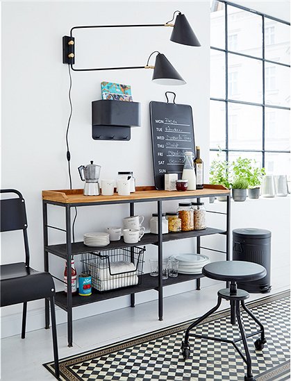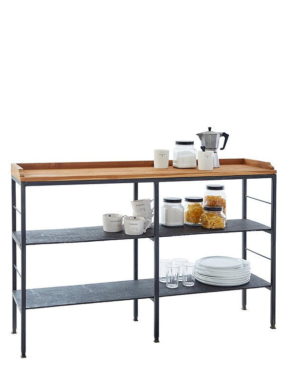 Ideal für Küche, Flur und Arbeitszimmer - der rustikale Konsolentisch mit Teakplatte hat ein geradliniges Metallgestell und zwei komfortable Ablagefächer unter der Deckplatte. Das Regal bietet Stauraum für Küchenutensilien und Büromaterial und genügend Platz auf der Arbeitsfläche. Der schöne Tisch passt dank seiner geringen Tiefe von nur 32 cm auch in schmale Räume und eignet sich daher auch wunderbar als Sideboard im Flur. Die beiden Regalfächer sind aus schwarz lackiertem Holz und bieten einen nahtlosen Übergang zum Metallrahmen. Das massive Teaktop hat eine umlaufende Leiste und schützt so empfindliche Dinge. Die Anrichte wir fertig montiert geliefert und kann sofort aufgestellt werden.