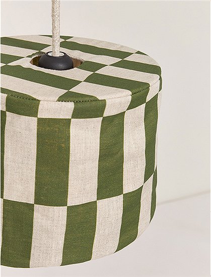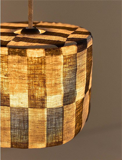senfgelbe, kastanienbraune, schwarze oder grüne Rechtecke - immer im Zusammenspiel mit dem naturfarbenen Leinenschirm.