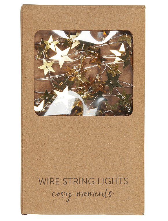 Funkelnde Sterne. Die wundervolle Lichterkette mit 20 goldenen Sternen von Ib Laursen ist ein absoluter Blickfang! Sie erstreckt sich über eine Länge von 190 cm und besteht aus einem filigranen Draht, der mit kleinen goldenen Sternen und Lichtern im Wechsel versehen ist. Die Lichterkette ist zur Verwendung im Innenbereich vorgesehen. Die goldenen Sterne erzeugen eine stimmungsvolle Atmosphäre und können ganz vielfältig dekoriert werden - hübsch in einem weihnachtlichen Gesteck, in der Mitte entlang des gedeckten Tisches, auf der Fensterbank oder in einer gläsernen Laterne. Deko-Tipp: Besonders schön in Szene setzt die Lichterkette den Hänger mit vier Ringen des dänischen Labels. Bitte denke daran, dass für den Betrieb drei AA-Batterien erforderlich sind, die nicht im Lieferumfang enthalten sind. Die zauberhafte Lichterkette ist eine tolle Ergänzung von Geschenken für deine Liebsten. Bring' deine Dekorationen mit der bezaubernden Lichterkette mit 20 goldenen Sternen von Ib Laursen zum Strahlen! Wir wünschen viel Freude damit.