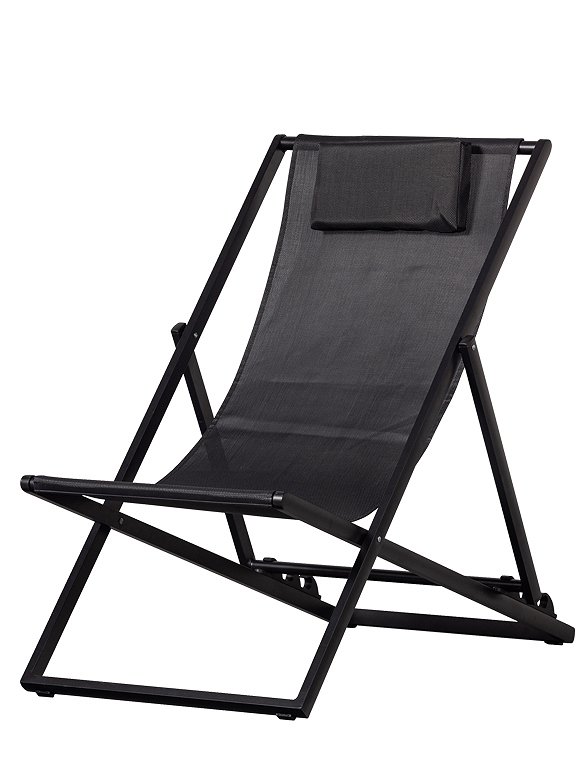 Garantiert dir endloses Faulenzen! Der Liegestuhl Esper von Exotan ist ideal für Balkon oder Garten - und natürlich für den Strand - denn bei Bedarf kannst du den leichten Stuhl ganz einfach mitnehmen. Der bequeme Outdoor-Stuhl inklusive kleinem Kissen - mit leichtem Aluminiumrahmen und einer Sitzfläche aus schwarzem Textilene ist unkompliziert und vielseitig in der Nutzung. Textilene ist ein sehr flexibles und reißfestes Material, das aus Kunstfasern besteht, die mit PVC ummantelt sind - eine sehr robuste Faser die wasserabweisend und pflegeleicht ist. Der schwarze Stuhl lässt sich leicht zusammenklappen, wird montiert geliefert, ist 74 x 102 x 61 cm groß und hat eine Sitzfhöhe von 33- 35 cm. Der Stuhl lässt sich in drei unterschiedliche Sitz Positionen einstellen. Im Freien schützt du den Liegestuhl am Besten mit einer Plastikfolie oder Schutzhülle vor starkem Regen, Nachtfrost und der Winterzeit. Wenn möglich, lass das hübsche Möbel drinnen überwintern. Der Rahmen aus Aluminium wirkt korrosionshemmend und eignet sich daher sehr gut für den Außenbereich. Hab viel Spaß mit dem Liegestuhl Esper von Exotan und genieße den Sommer.Details: