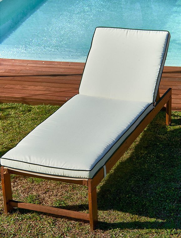 Liegestuhlauflage Cloud von Calma House - eine großartige, wasserfeste Sonnenliegenmatte - mit elastischen Schnüren zum Befestigen an der Sonnenliege. Der Bezug der Matratze ist mit wasserabweisendem Polyester ausgestattet, so kannst du die Auflage auch schon einmal draußen liegen lassen. Die hübsche outdoor Unterlage ist in zwei Farben erhältlich - ecru mit schwarz abgesetzten Keder eingefasst, und die rosa Matte ist Ton in Ton gearbeitet. Das Bodenkissen ist ein vielseitiger Begleiter für Unterwegs und deinen Garten - es ist so gut gepolstert, dass du es auch ohne Liege nutzen kannst. Hab viel Spaß an der Liegestuhlauflage Cloud von Calma House - und genieße den Sommer!