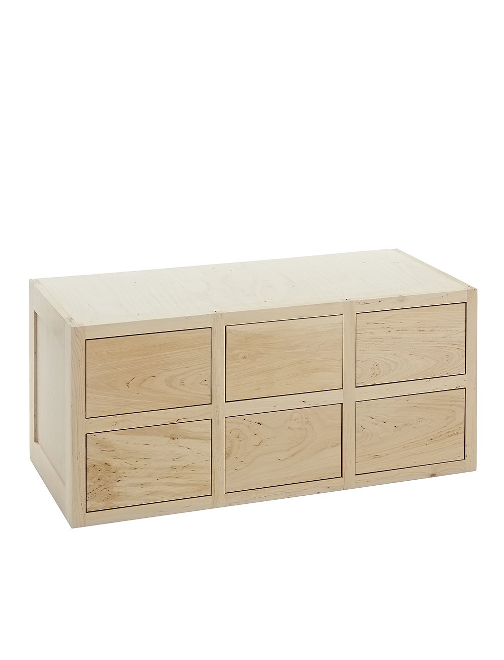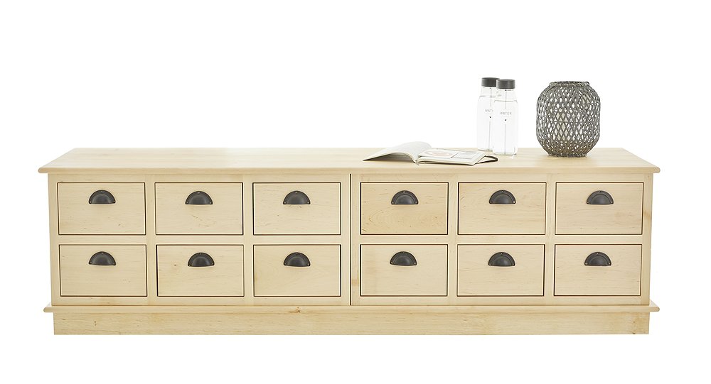 Ideal für Nischen: Durch die geringe Höhe ist das Lowboard aus unbehandeltem Erlenholz super für Räume mit Dachschrägen oder Wandvorsprüngen geeignet. So können mit Hilfe der zwölf Fächer und der beachtlichen Breite des Möbelstücks immer noch allerhand Gegenstände darin verstaut und die "Problemzone" des Raumes genutzt werden. Natürlich kann das exklusive car Möbel-Modell auch in klassischen Raumbegebenheiten platziert werden: Im Flur taugt das Möbel nicht nur zur Aufbewahrung, sondern kann auch prima als Sitzbank genutzt werden. Oder Sie verwenden es als TV-Board im Wohnzimmer: Fernseher, Musikanlage und Dekorationen passen bestens auf die Ablagefläche, wohingegen die Schübe ordentlich Platz für CDs oder DVDs bieten. Das Lowboard aus Holz gehört zu unseren Wohnmodulen, die flexibel zu gestalten sind. Entdecken Sie auch weitere Möglichkeiten der Nutzung oder entwerfen Sie mit den unterschiedlichen Möbelvarianten, Türen und Sockeln Ihr ganz persönliches Lieblingsstück! Bitte beachten: Das Möbelstück wird ohne vorgebohrte Löcher und Griffe geliefert!