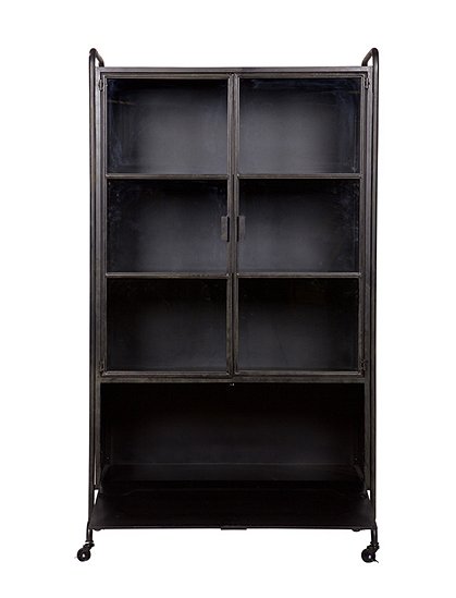 Die Metallvitrine von de Eekhoorn im Industrie Design ist dank ihrer Rollen trotz der Größe jederzeit beweglich. Die Metallvitrine eignet sich perfekt für die Küche, und kann jederzeit äußerst dekorativ Mengen an Geschirr verstauen. Die schwarze Vitrine hat drei Fächer hinter zwei Glastüren (mit sichtbaren Scharnieren) und ein Klappfach mit Kassettenfüllung. Die Vitrine wird zerlegt geliefert.Details: