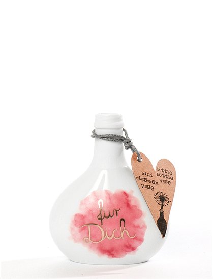Lass' Blumen sprechen. Mit den bezaubernden Mini Vasen von Good old friends schenkt man anderen oder sich selbst Flaschenweise Glück. Die kleinen Flaschenvasen geben Geburtstagsblümchen, zarten Gräsern und deinen Lieblingsblumen ein Zuhause und überbringen Blumengrüße mit Stil und ganz viel Herz. Dabei hat jedes Modell sein eigenes Motiv und seine ganz individuelle Botschaft. Die Formate reichen von schmal und hoch bis niedriger und bauchig. Daher lassen sich die einzelnen Vasen auch prima miteinander auf einem schönen Tablett oder dem Beistelltisch im Wohnzimmer kombinieren. Du kannst wählen zwischen dem Motiv Mädchen mit Pusteblume für gute Wünsche, einem liebevollen süßen Herz in rot, einer Geburtstags Vase mit "Blümchen, Glück oder einem glasierten "für Dich" in goldener Schrift auf einem zarten rosa Untergrund, "Wundervoll ist viel besser als perfekt" und der Botschaft "Man ist nie zu klein, um großartig zu sein" mit einer süßen goldenen Hummel. Jede Vase trägt ein hübsches graues Band am Flaschenhals mit einem Papieranhänger in Herzform. Hier findet sich auf der Rückseite noch Platz für kleine persönliche Grüße - sag' es durch die Blume! Wir wünschen viel Freude beim Schenken und Dekorieren der Mini Vasen von Good old friends.