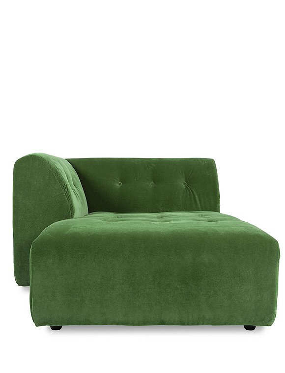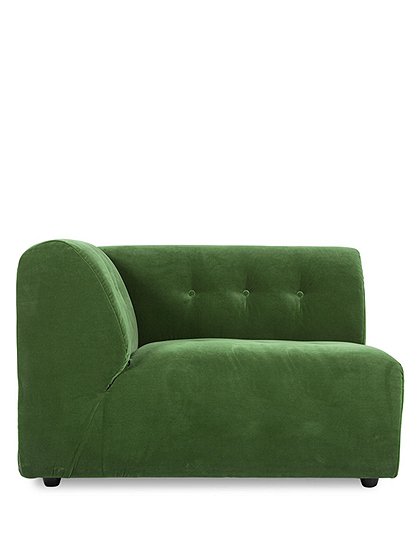 Mit dem wunderschönen Modulsofa Vint Samt grün von HKliving kreieren Sie sich Ihre ganz individuelle Sofalandschaft. Ob als Ecklösung, Loveseat, 2er, 3er, 4er Sofa - es sind Ihnen keinerlei Grenzen gesetzt. Sie können aus elf Sofamodulen wählen: linke oder rechte Ecke (1 Sitz oder 1,5 Sitze), Mittelteil (1- oder 1,5-Sitzer), Divan (rechts/links) und einem Hocker in zwei Formaten. Wer mag, kombiniert noch den passenden Loveseat dazu. Besonders praktisch ist, dass alle Module komplett mit demselben Stoff bezogen sind. Dadurch haben Sie eine größtmögliche Flexibilität bei der Raumgestaltung und können diese auch immer wieder variieren. Die organische Form der Sofaelemente ist zeitlos schön. Insgesamt stehen neben dem grünen Samtbezug noch viele weitere Bezüge zur Auswahl: Entdecke drei Bezüge aus dem Trendmaterial Cord, weitere Samtbezüge in magnolia, mint, mustard oder Bezüge aus Boucle oder Leinenstoff. Folgender Link führt Sie zu einer Übersicht für genaue Informationen über die Zusammensetzung der Bezüge und deren Pflege. Auf Wunsch senden wir Ihnen gerne ein Stoffmuster zu. Schicken Sie uns dazu bitte eine kurze Anfrage zum Produkt mit Angabe der gewünschten Farbe. Das Fixieren der Couchelemente untereinander ist denkbar einfach dank der mitgelieferten Klammern. Kreieren Sie sich Ihr ganz persönliches Modulsofa Vint Samt grün von HKliving zum Wohlfühlen. Details: