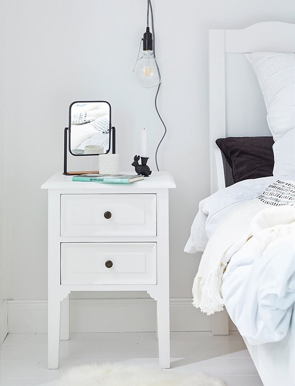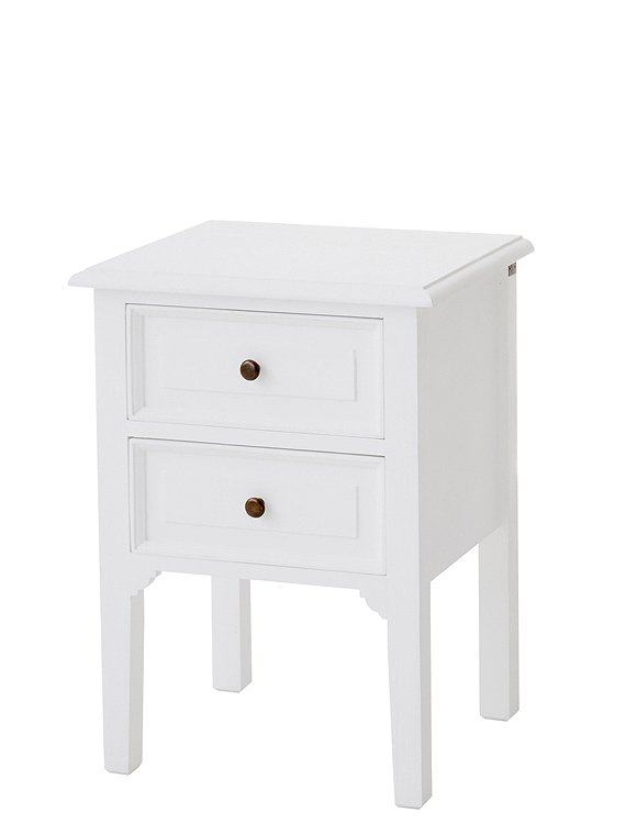 Süßer, kleiner Nachttisch aus Kiefernholz mit zwei praktischen Schubladen. Der kleine Tisch beherbergt gerne Lieblingsbücher, Handcreme und den Wecker - und der Platz für die Leseleuchte ist auch gleich garantiert. Der im Landhausstil aus Massivholz gearbeitete Tisch ist weiß, mit sichtbarem Pinselstrich, lackiert und lässt sich mit einer Vielzahl von Betten prima kombinieren. Die optisch ausgewogene Kommode hat ein etwas überstehendes Top, zwei Schübe mit Griffen und gerade geschnittene Füße. Der kleine Beistelltisch eignet sich fürs Kinder- genauso wie fürs elterliche Schlafzimmer und lässt sich ganz charmant mit anderen Wohnstilen zusammenbringen. Der Nachtschrank aus Kiefernholz ist ein exklusives car Möbel Modell - von uns entworfen, in Europa hergestellt und fix und fertig montiert geliefert. Viel Spaß damit!