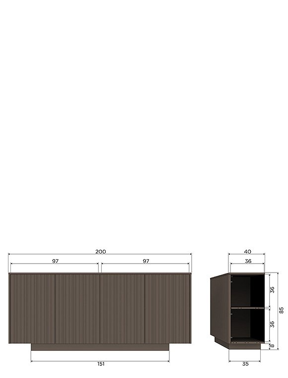Maße (HxTxB): 85 x 40 x 200 cm Dicke der Türen: 2,4 cm Gewicht pro Regalboden: 15 kgGewicht: 44 kg Material: Korpus: Kiefer, FSC zertifiziert, trüffelbraun Hinweis:Vergewissere dich, dass der Kippschutz richtig angebracht ist, um Unfälle zu vermeiden.Um harte Böden zu schützen, lege Filzgleiter unter die Beine.